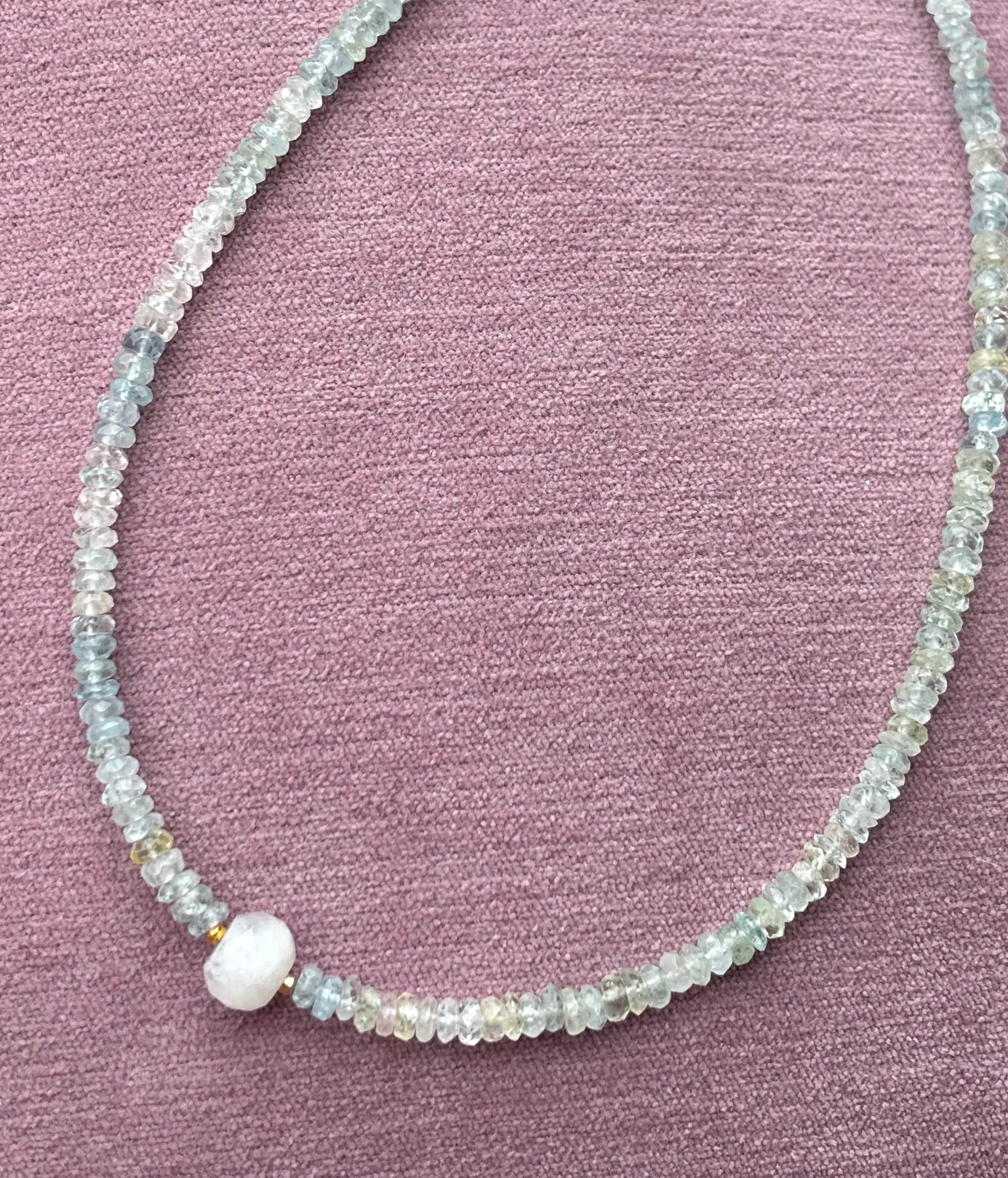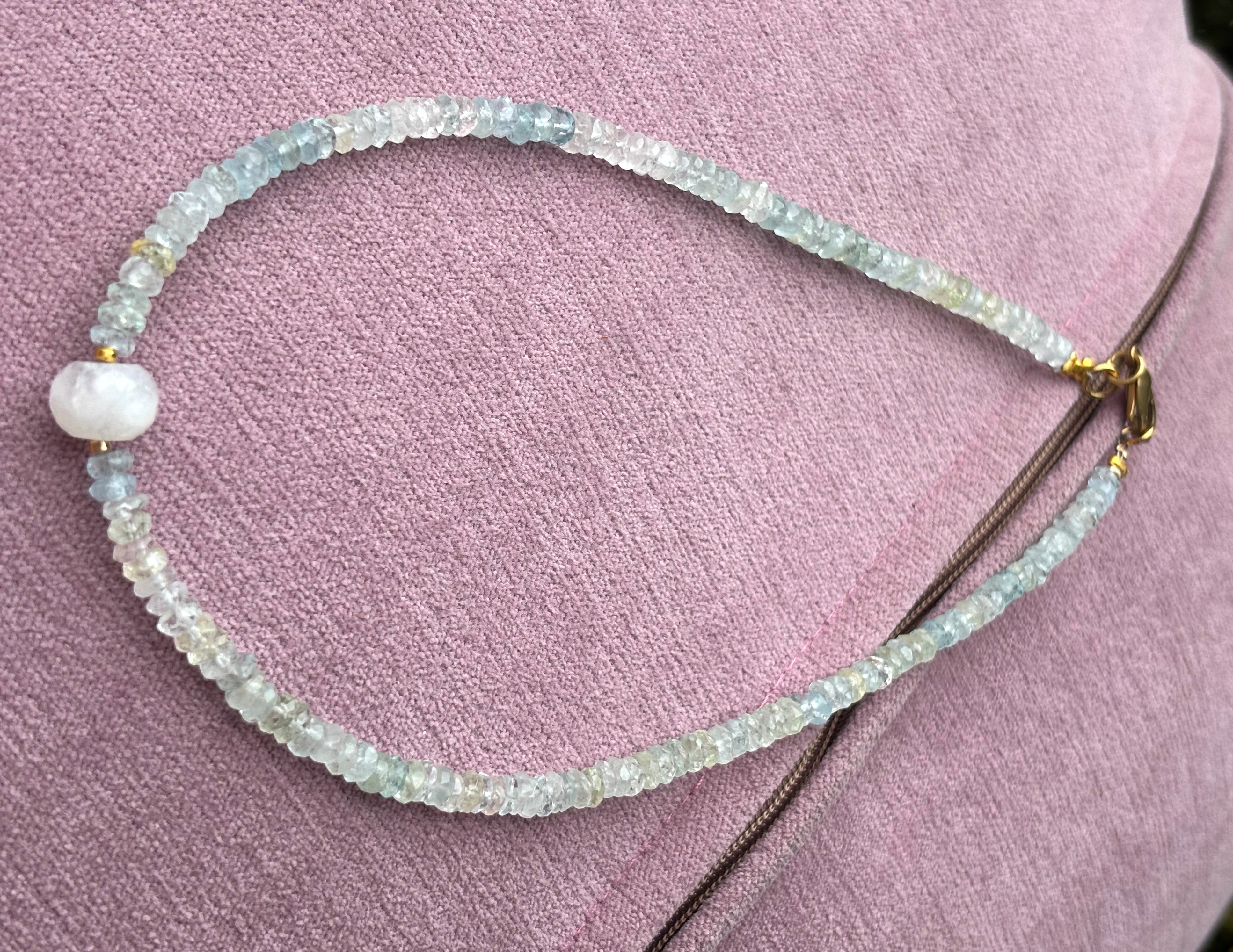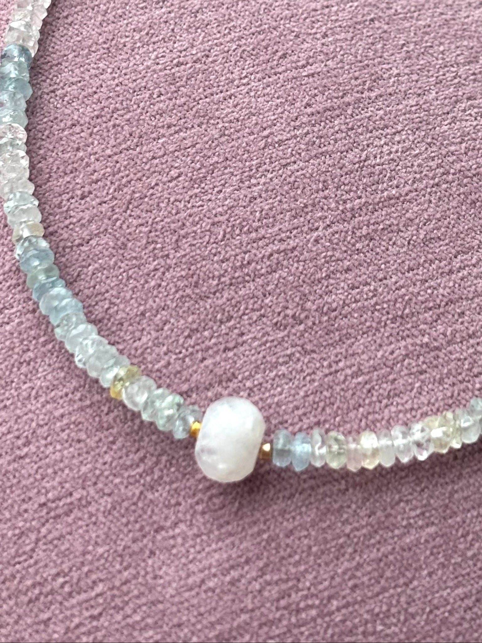 This delicate Moonstone and Morganite necklace feels like a breath of calm—subtle, luminous, and quietly grounding. Faceted Morganite beads shimmer in soft blush and pale aqua tones, while a single Moonstone bead rests at the center, glowing with an ethereal, moonlit softness.