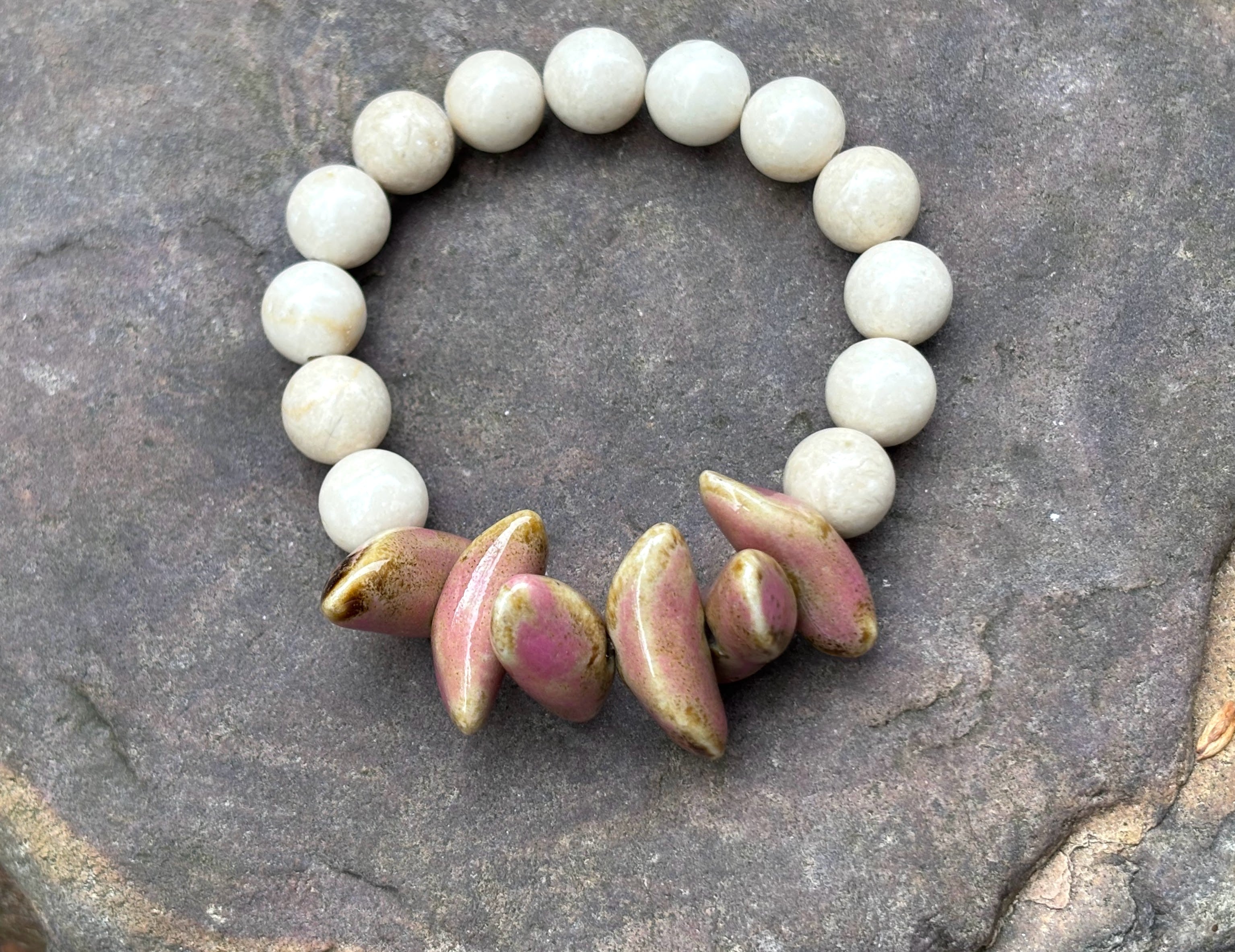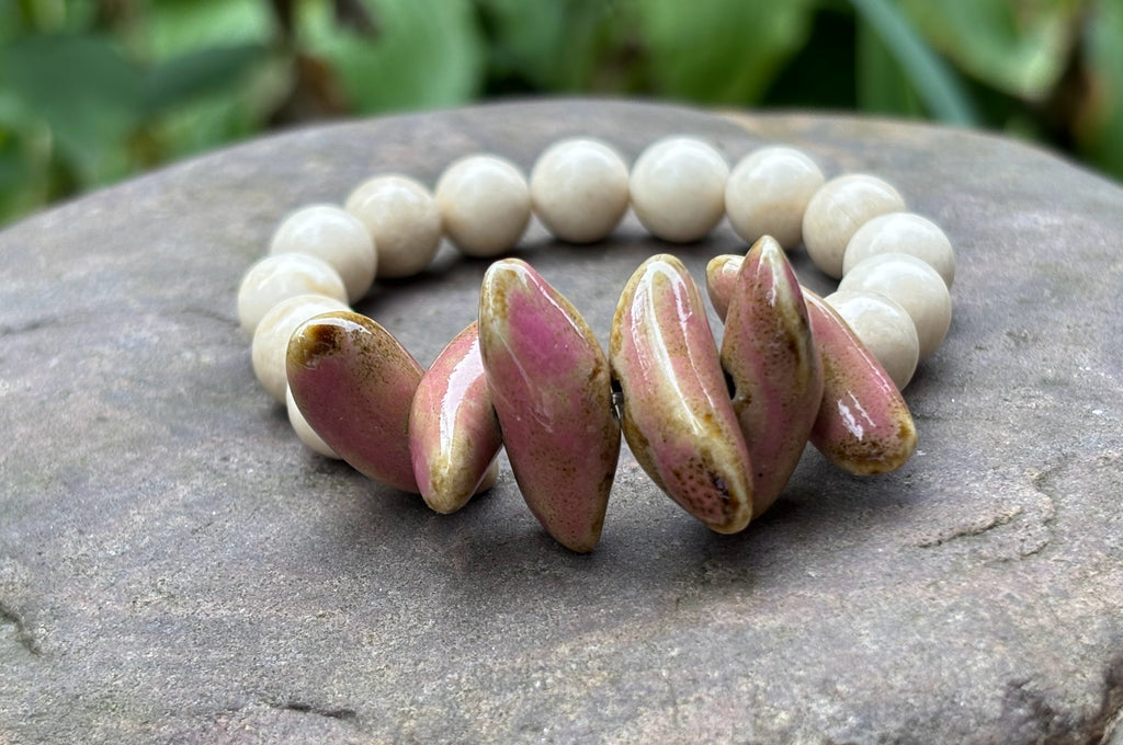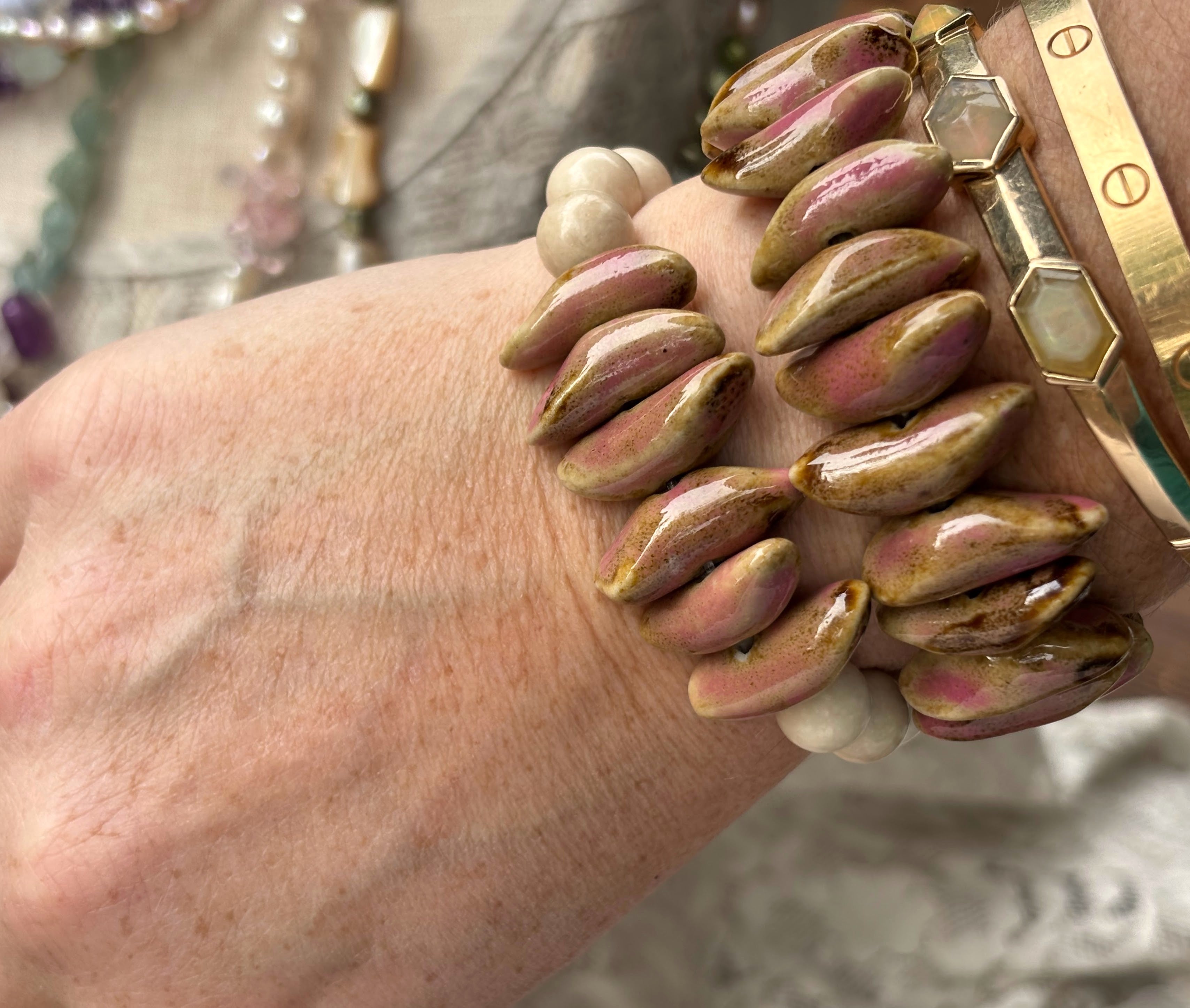 Organic seed pod ceramic beads bracelet. Soft pinks and muted olive gold tones, earthy flower power feel. High gloss kiln fired feel.