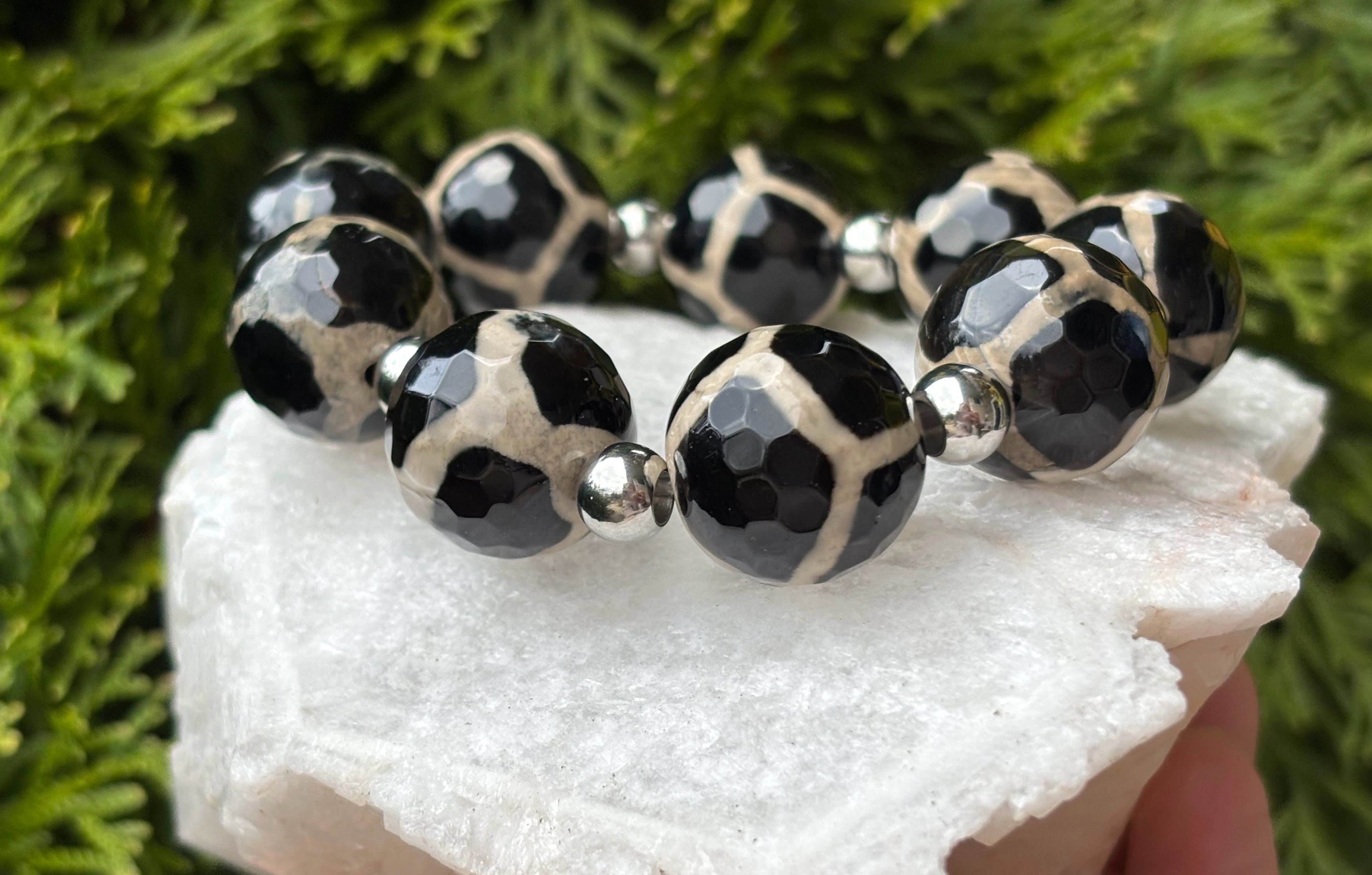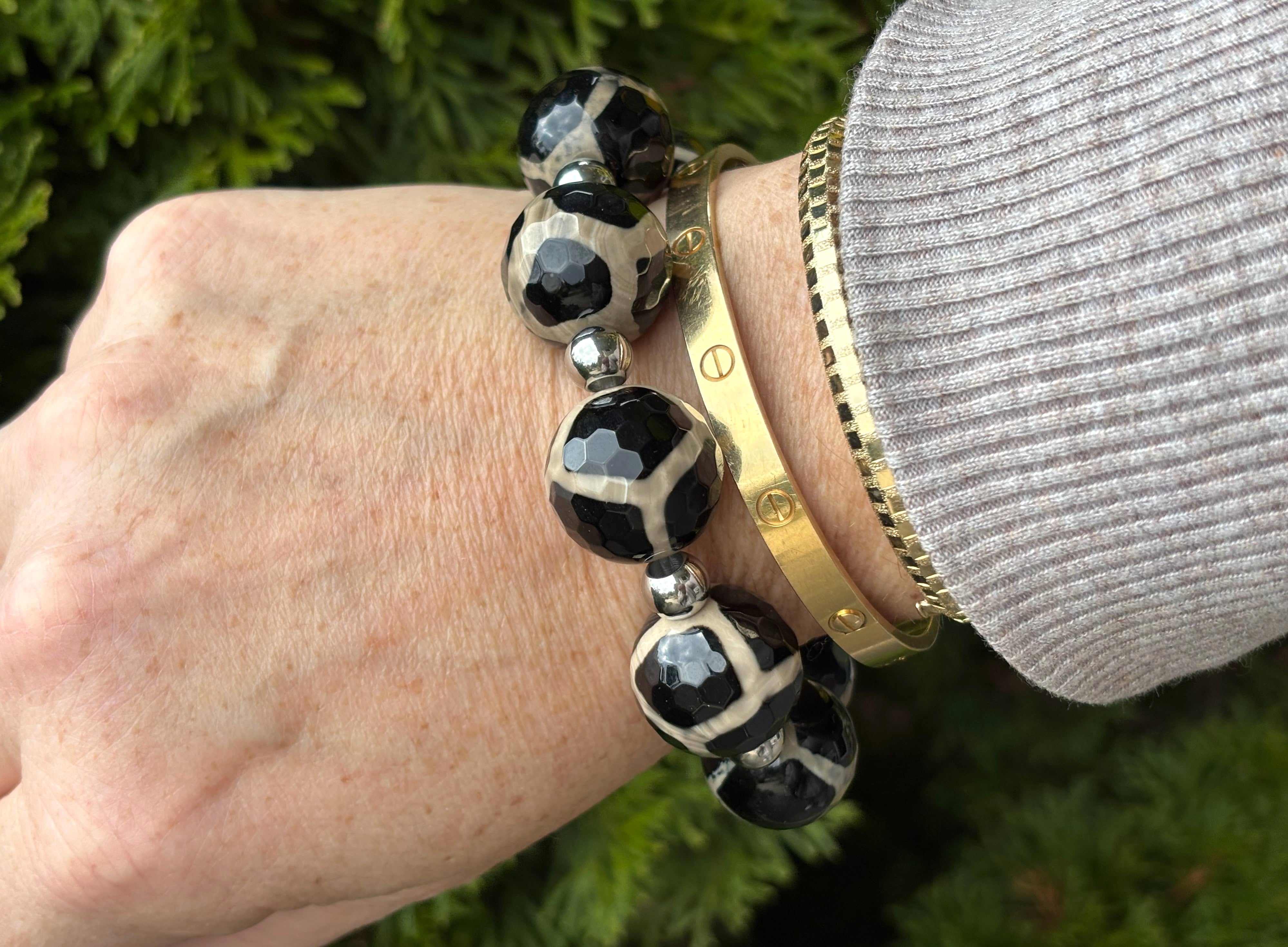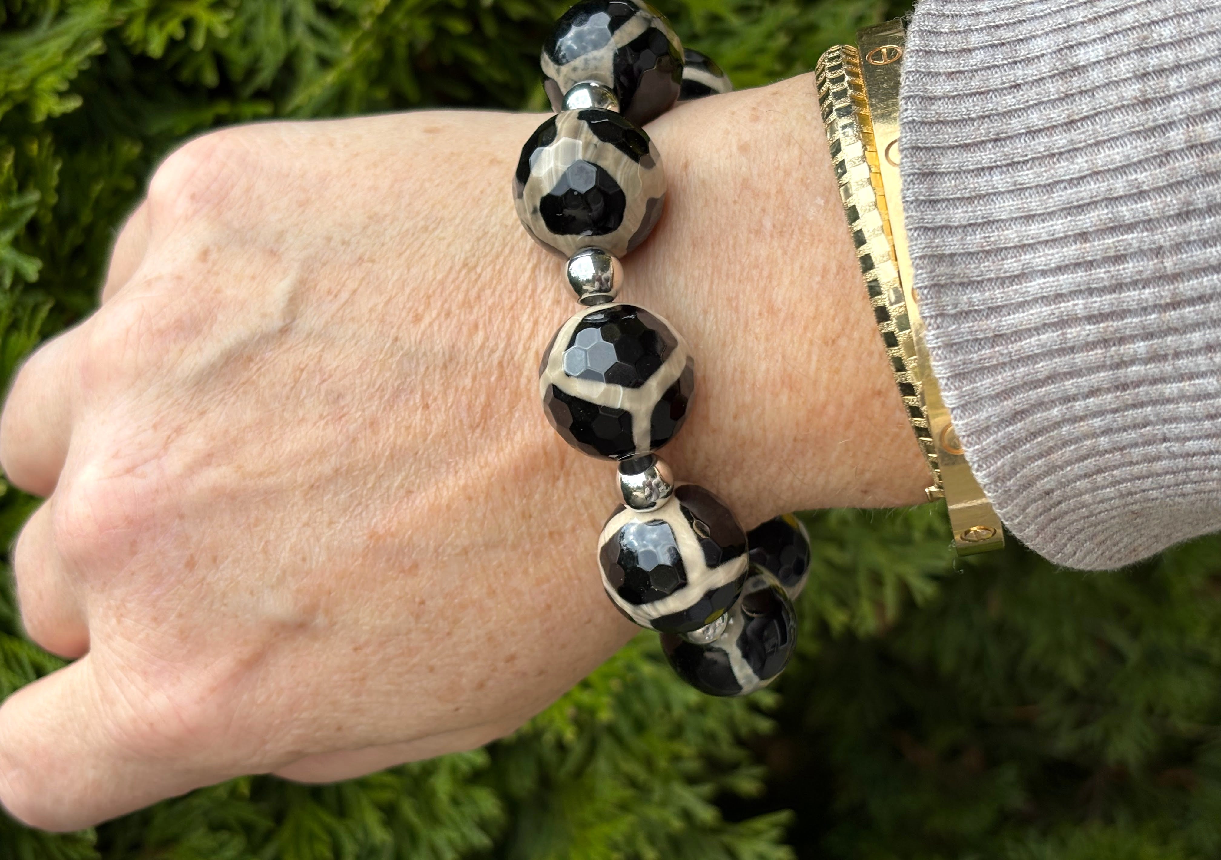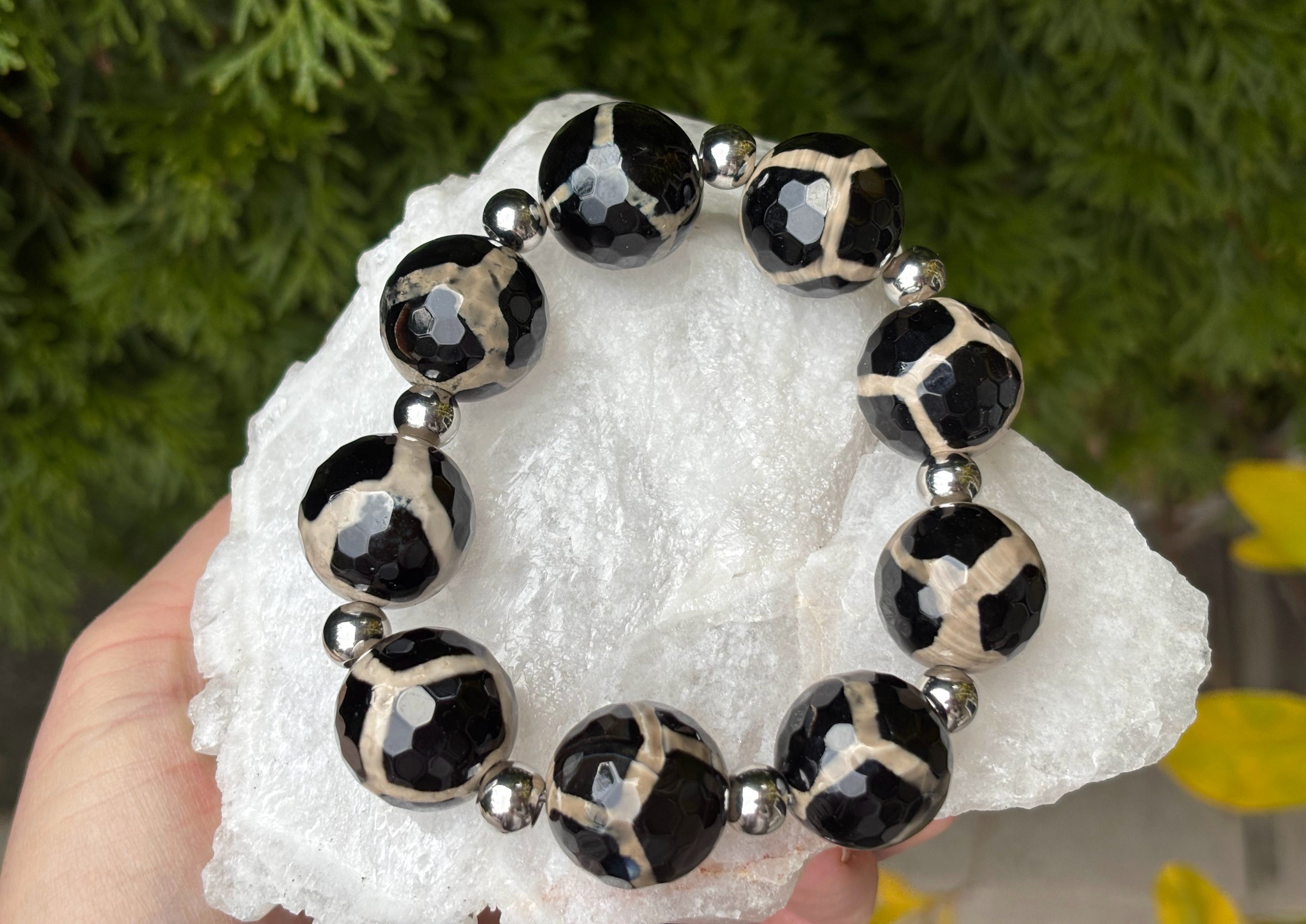 Chunky DZI bead bracelet. Magnificent 16mm ish black and cream faceted vintage Agate beads, accentuated with stainless steel balls.