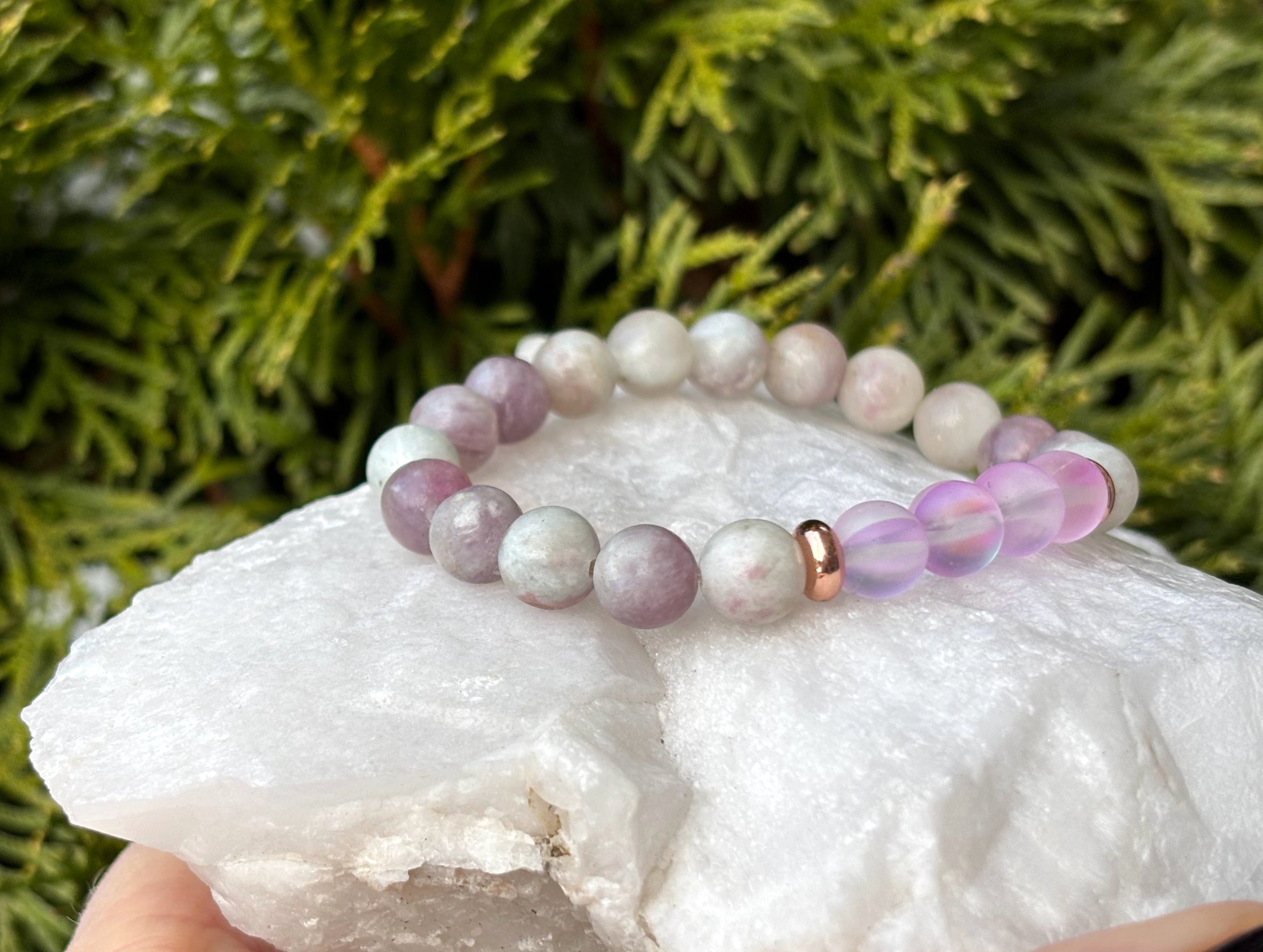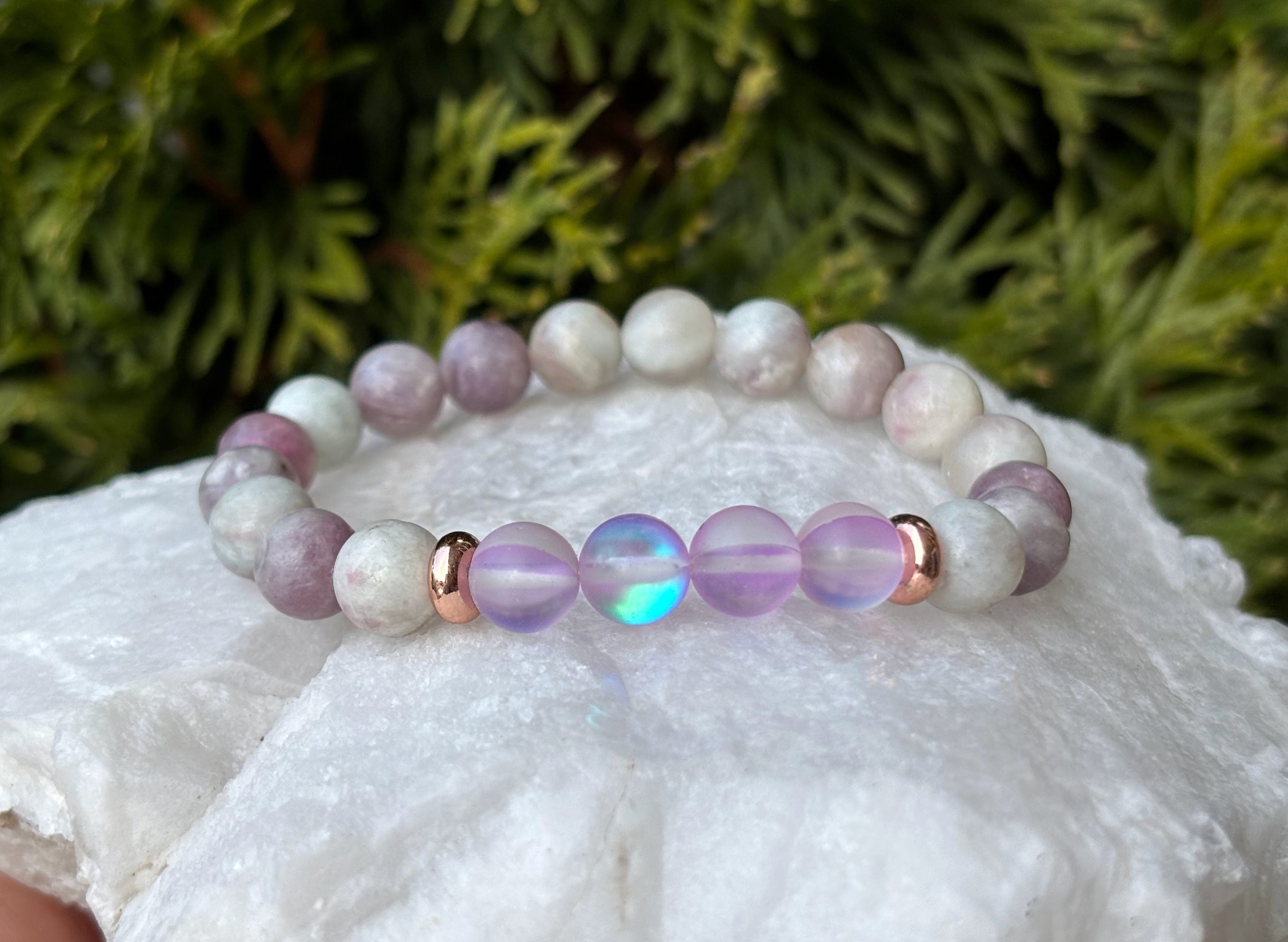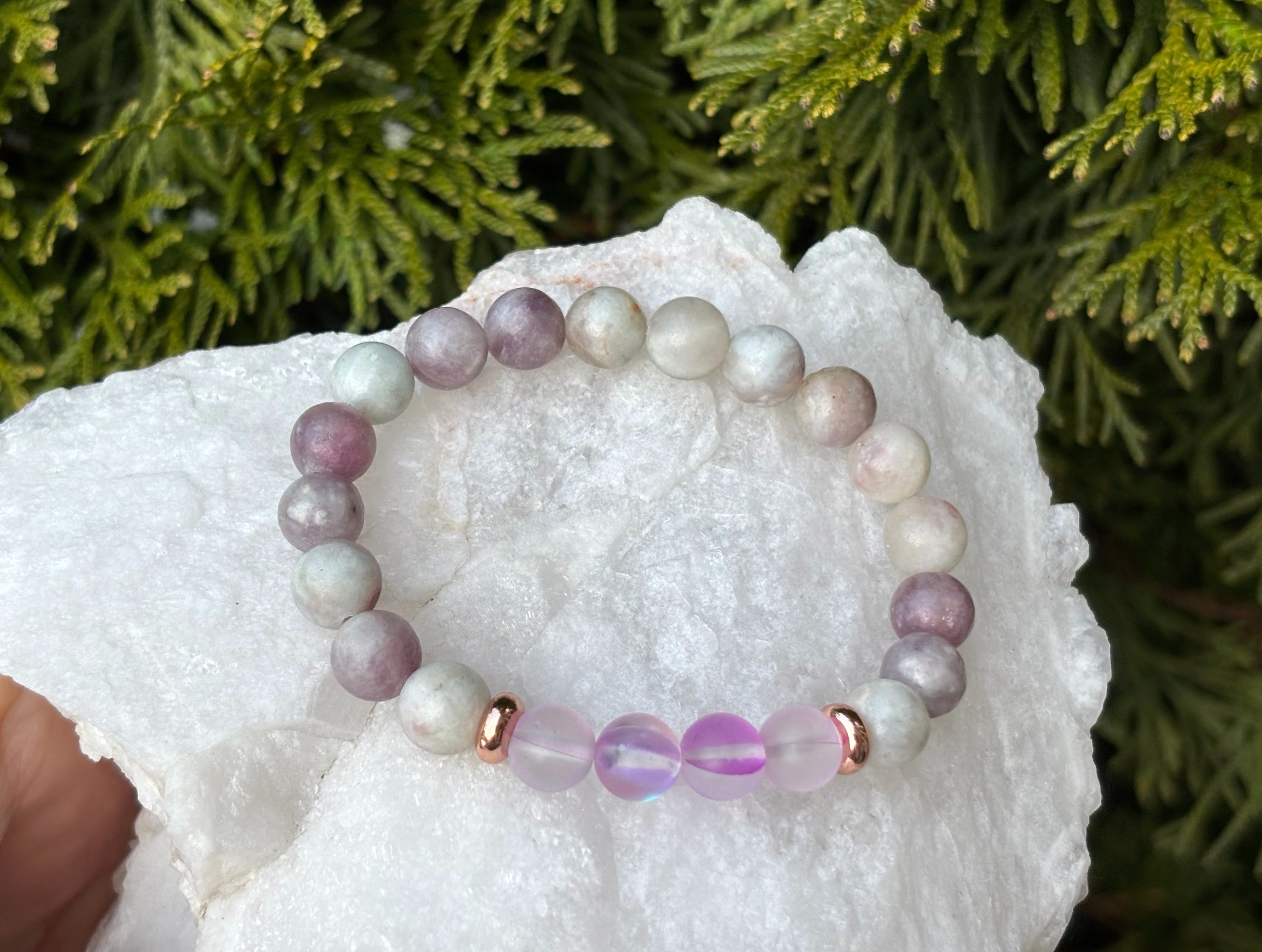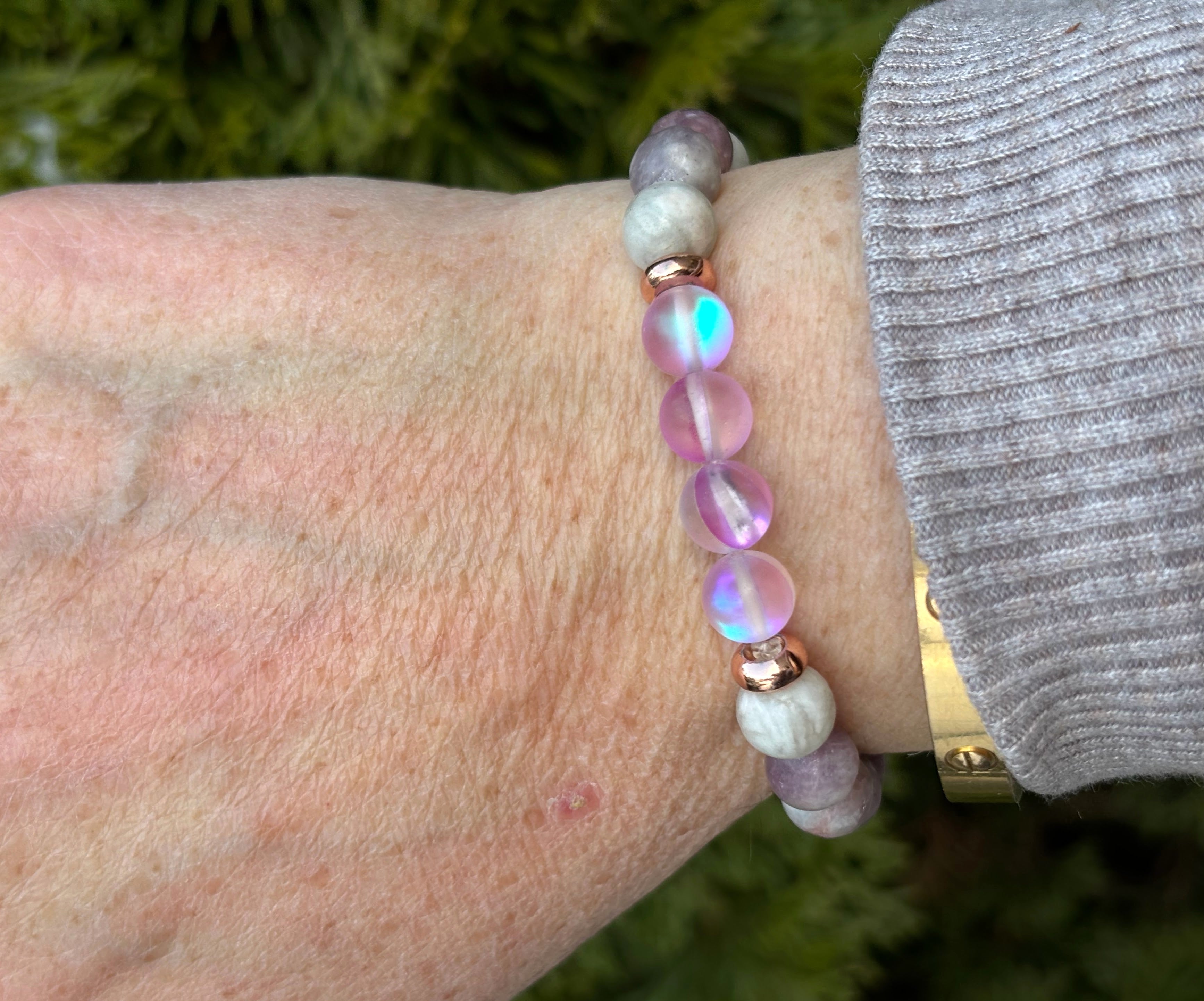 Tourmaline flower blossom bracelet. 8mm matte polished light creamy purple plum hued Tourmaline, ,Austrian man made Moonstones + rose gold accents.