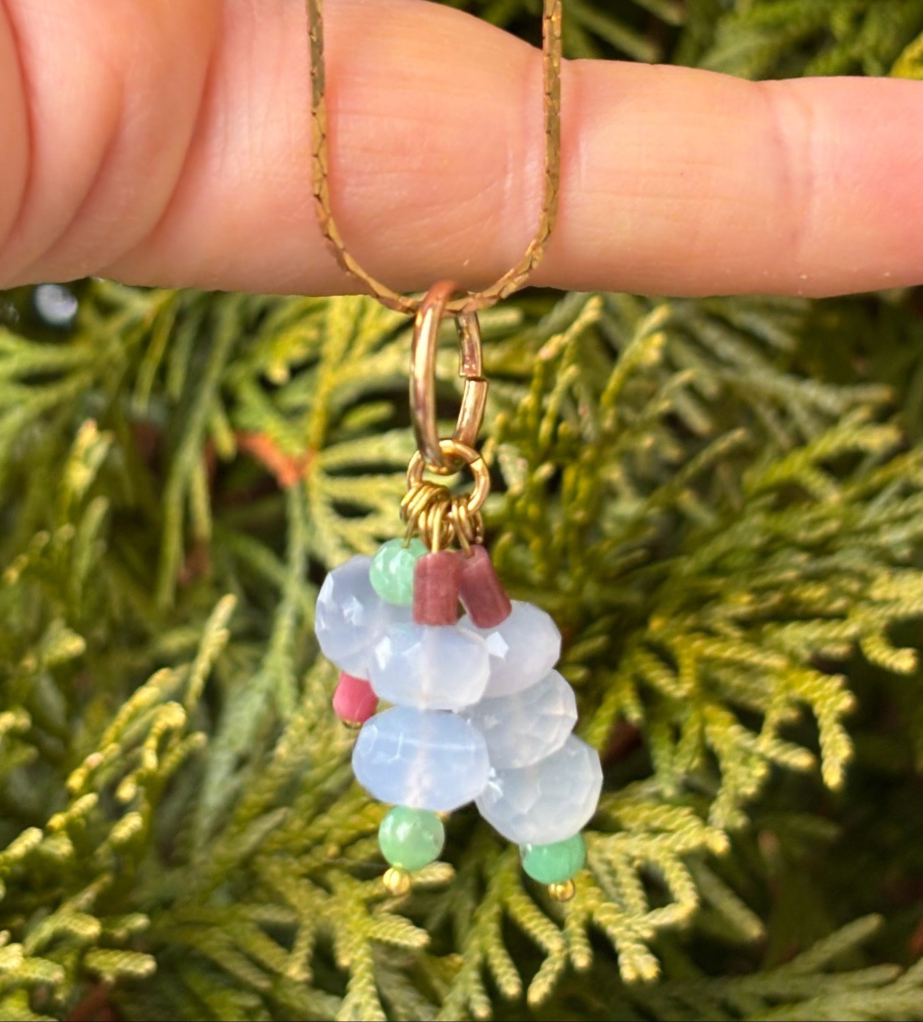 Delicate yet expressive, the Blossom Drift necklace blend soft pastel hues with intentional design. Featuring luminous blue chalcedony, nurturing rhodonite, and refreshing chrysoprase, these earrings capture the gentle beauty of renewal, emotional balance, and fresh beginnings.