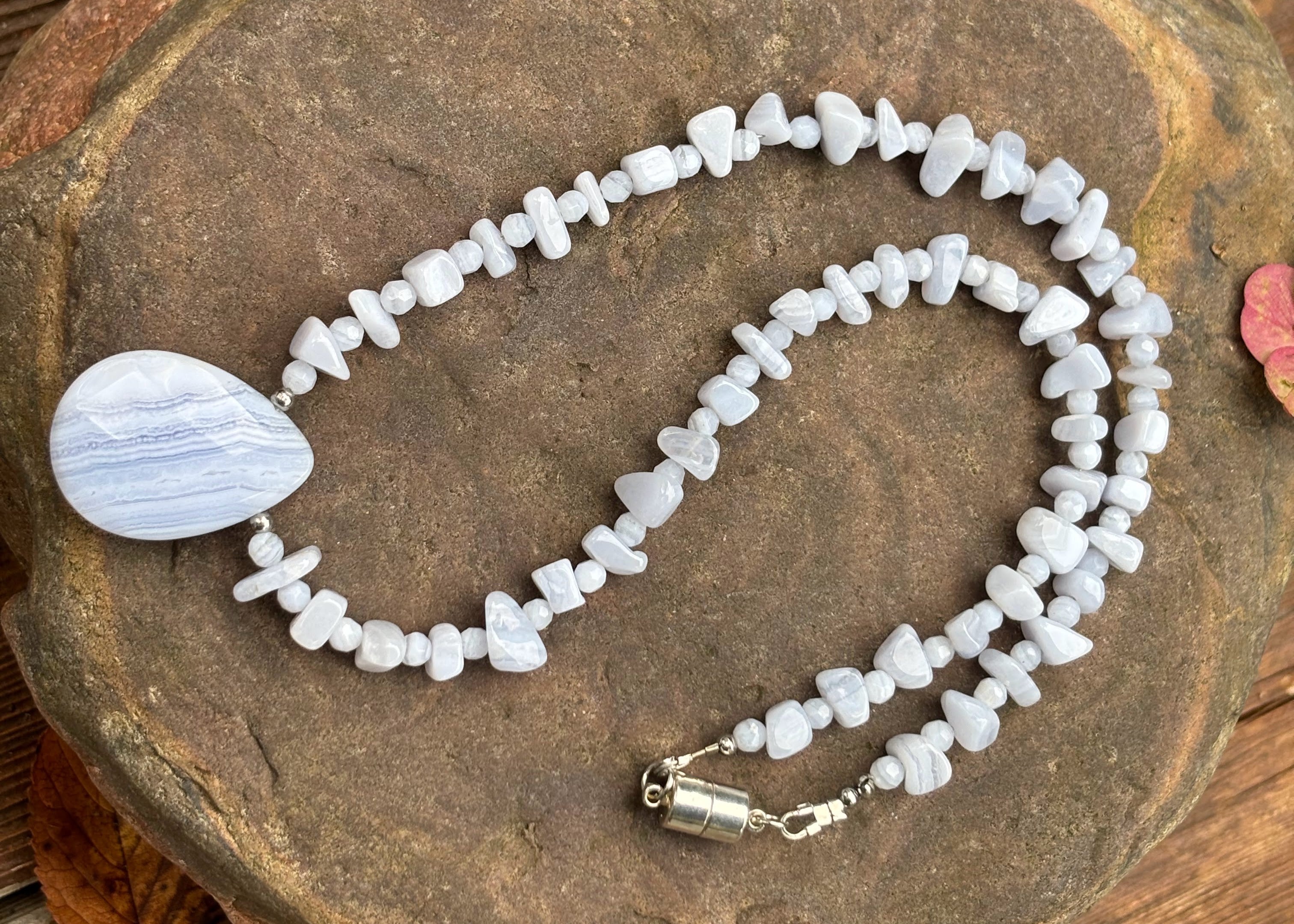 Light sky blue Blue Lace Agate necklace. Square and round beads with large oval pendant. Silver accents. Magnetic Clasp. Colour is difficult to capture, IRL it is in between the ightest and the darkest photo.