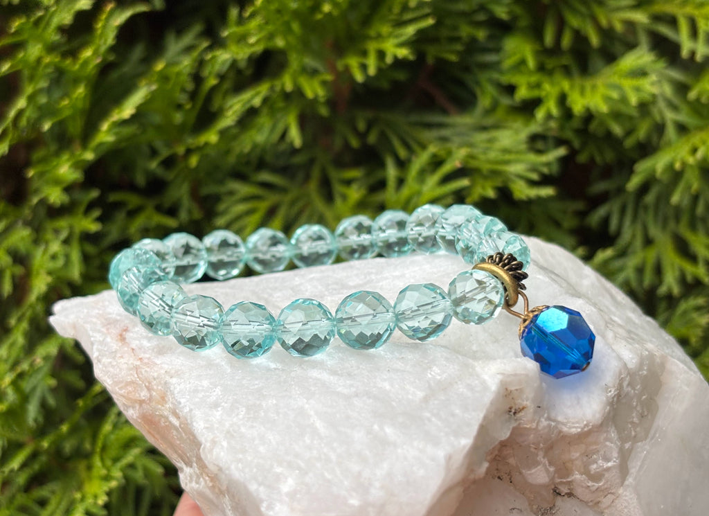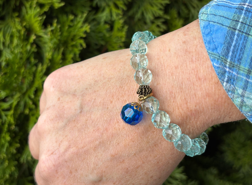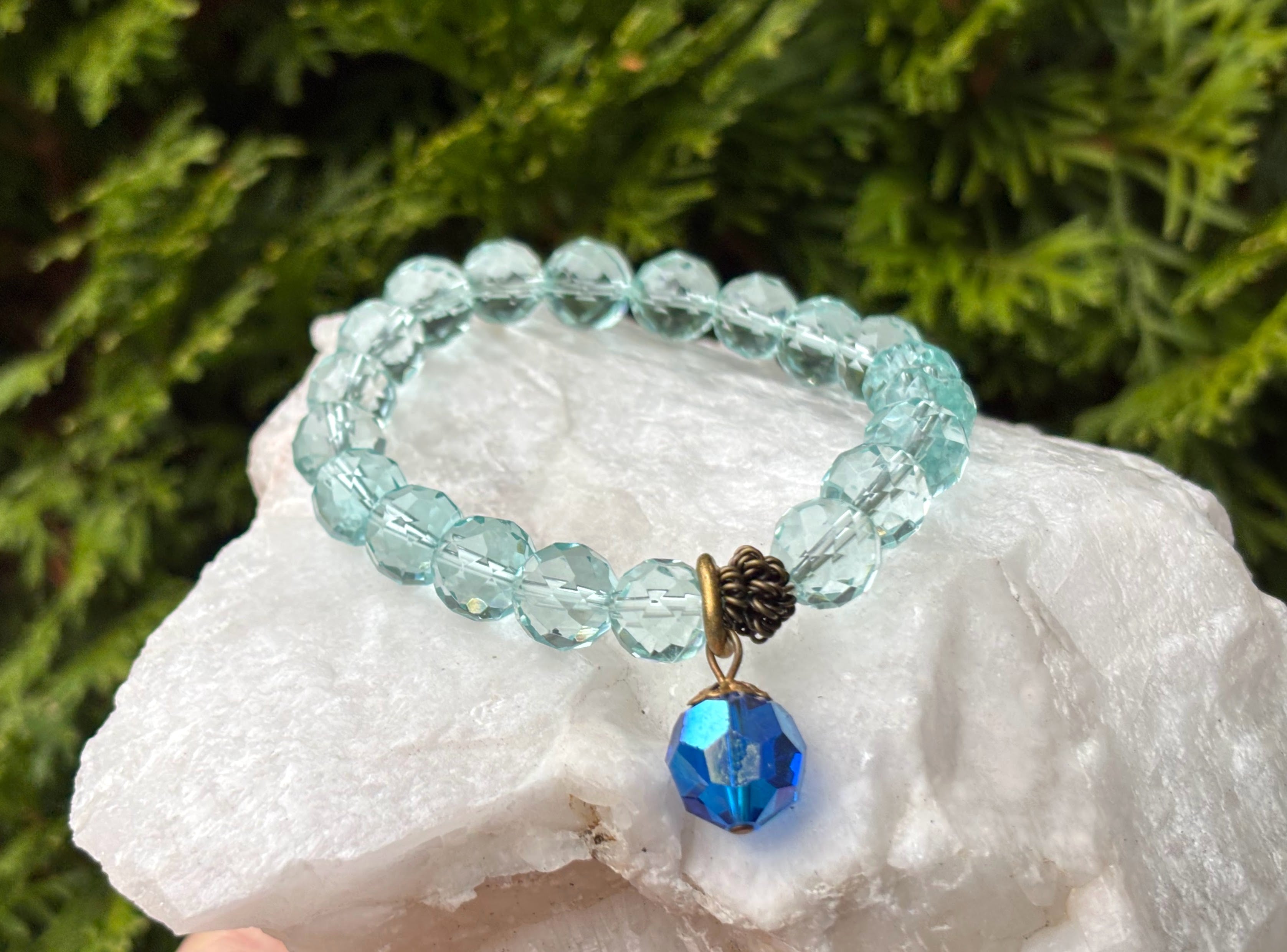 Vintage Austrian cut crystal beads, light blue beads, navy aurora borealis dangle charm. Accented with vintage brass findings.
