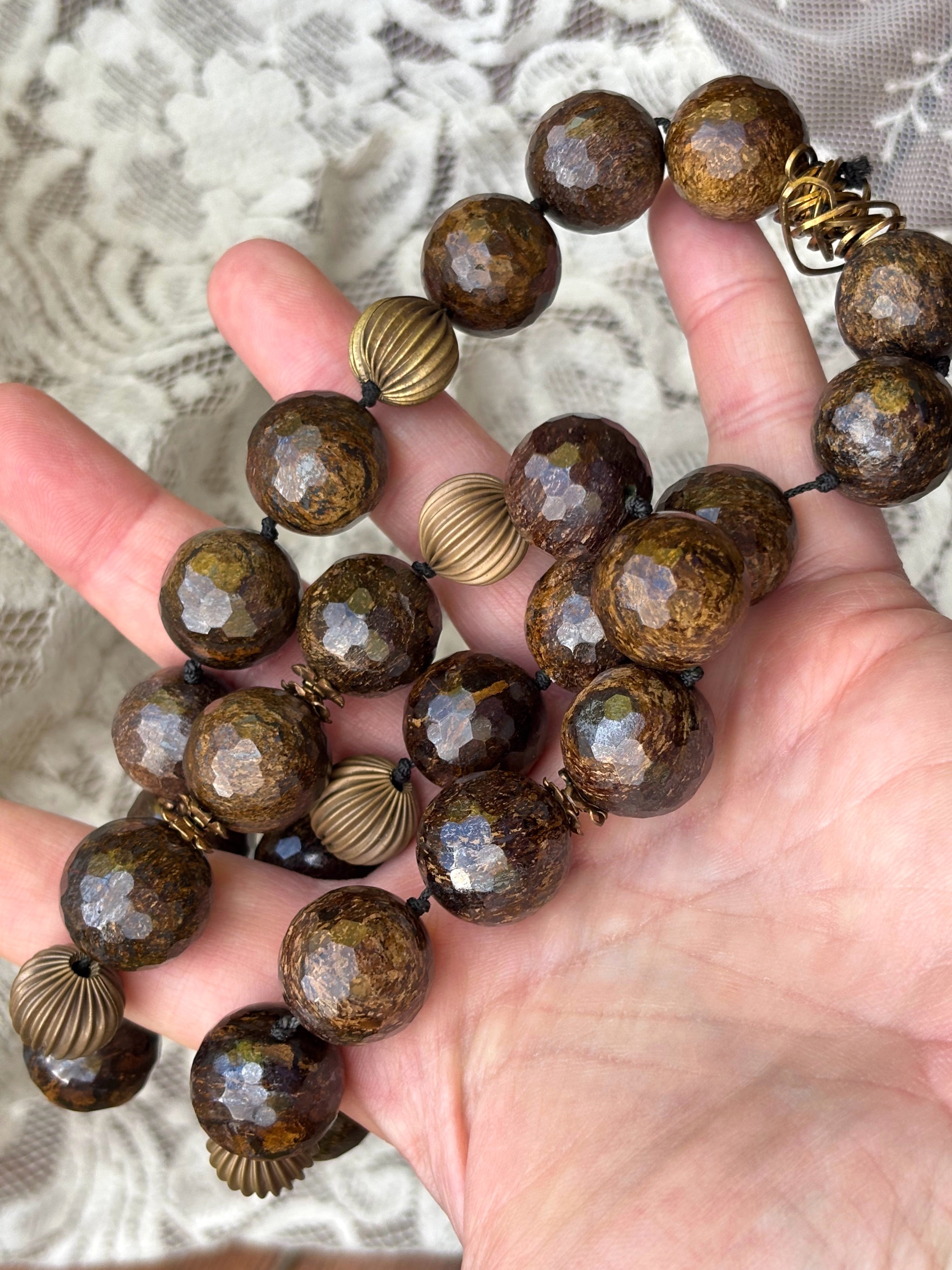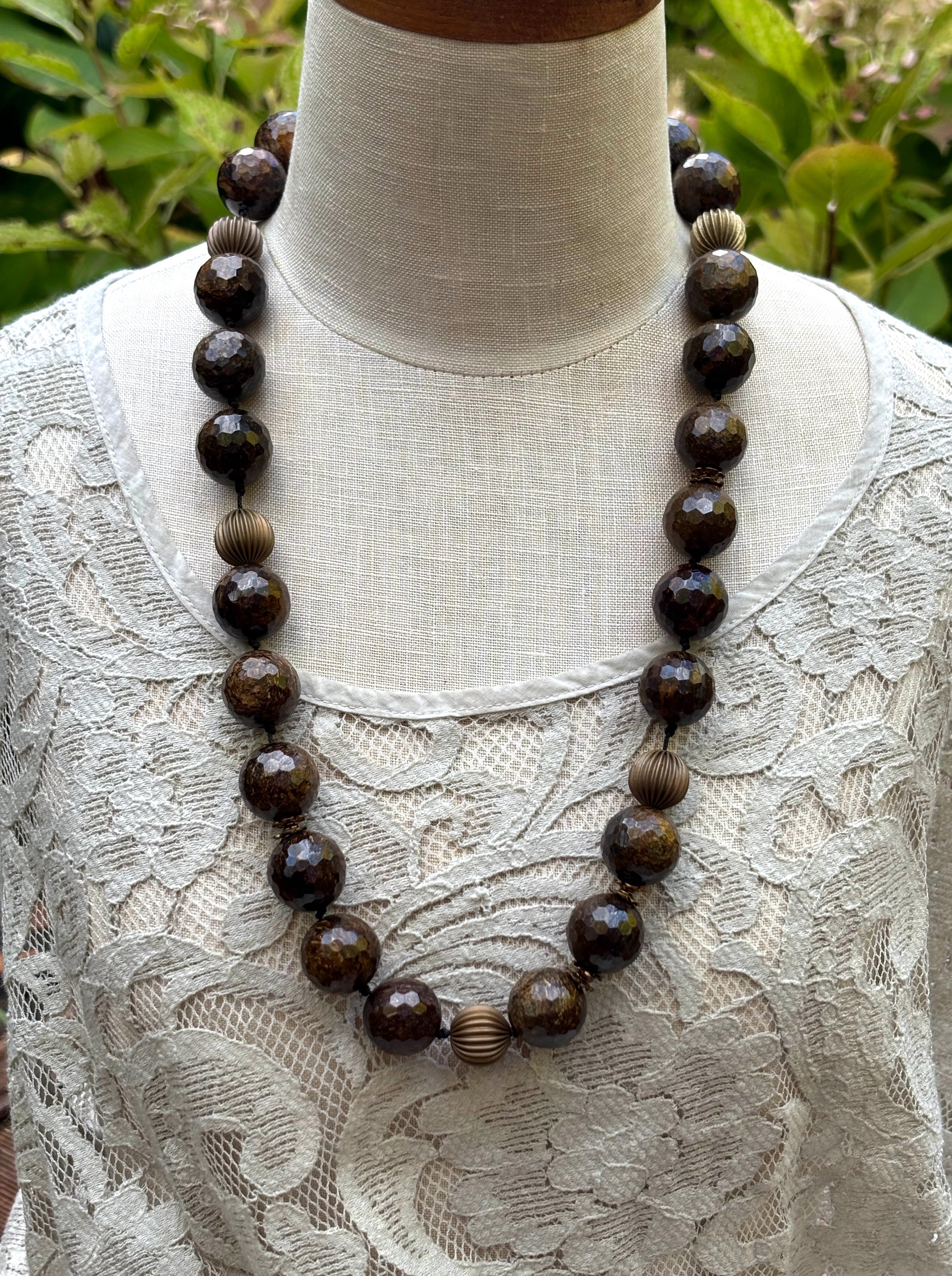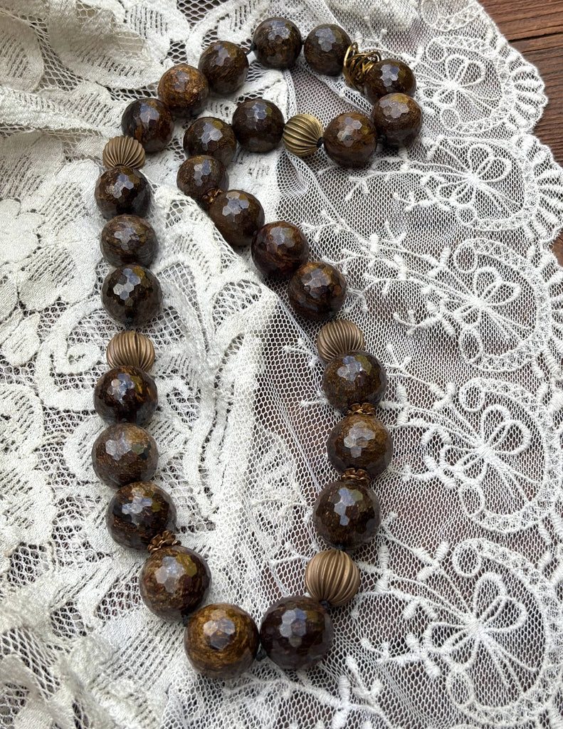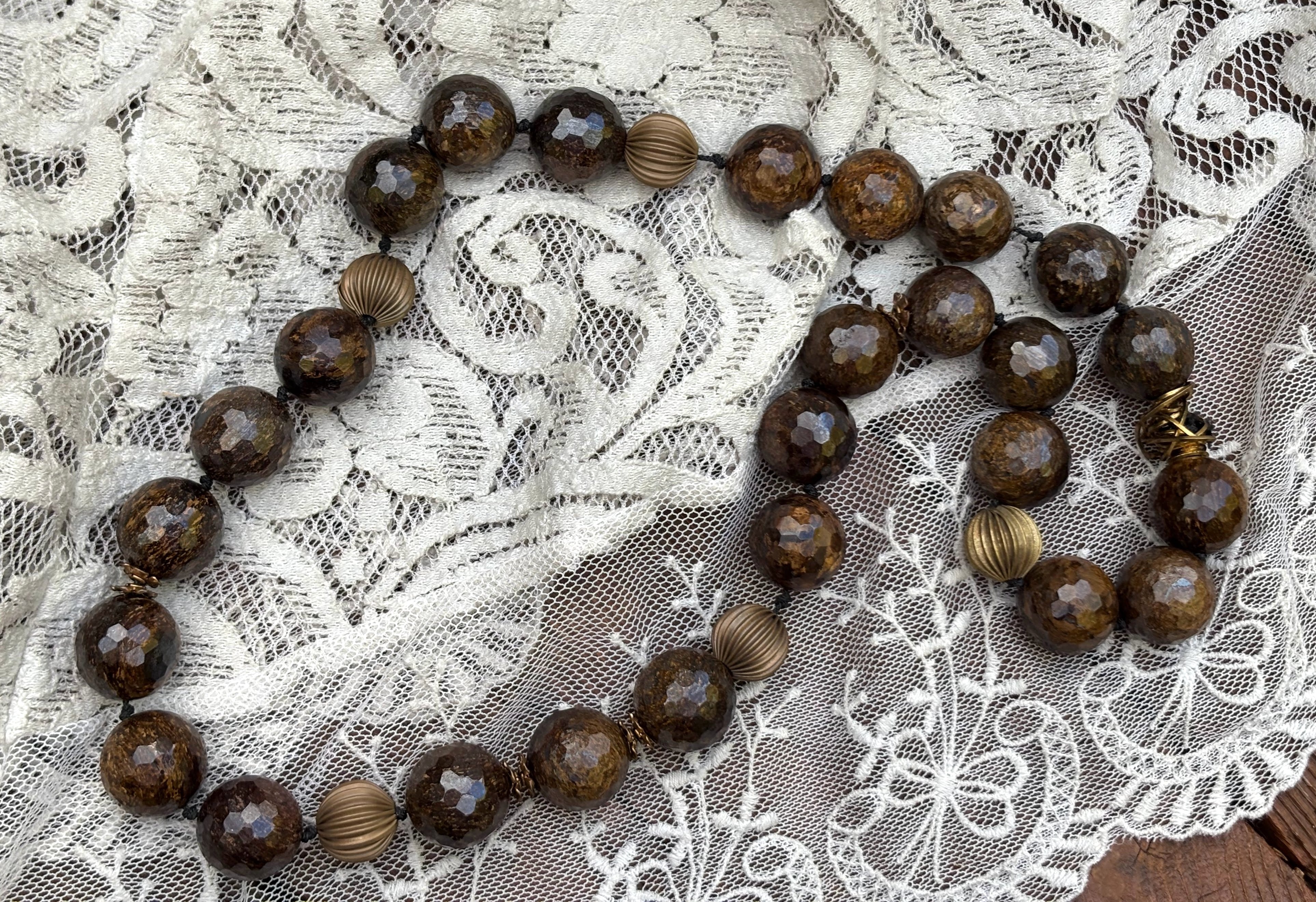 Magnificent bold balls of Bronzite + brass balls necklace, accented with vintage brass rhinestone backs as spacer accents. Approximately 20 mm bead size.