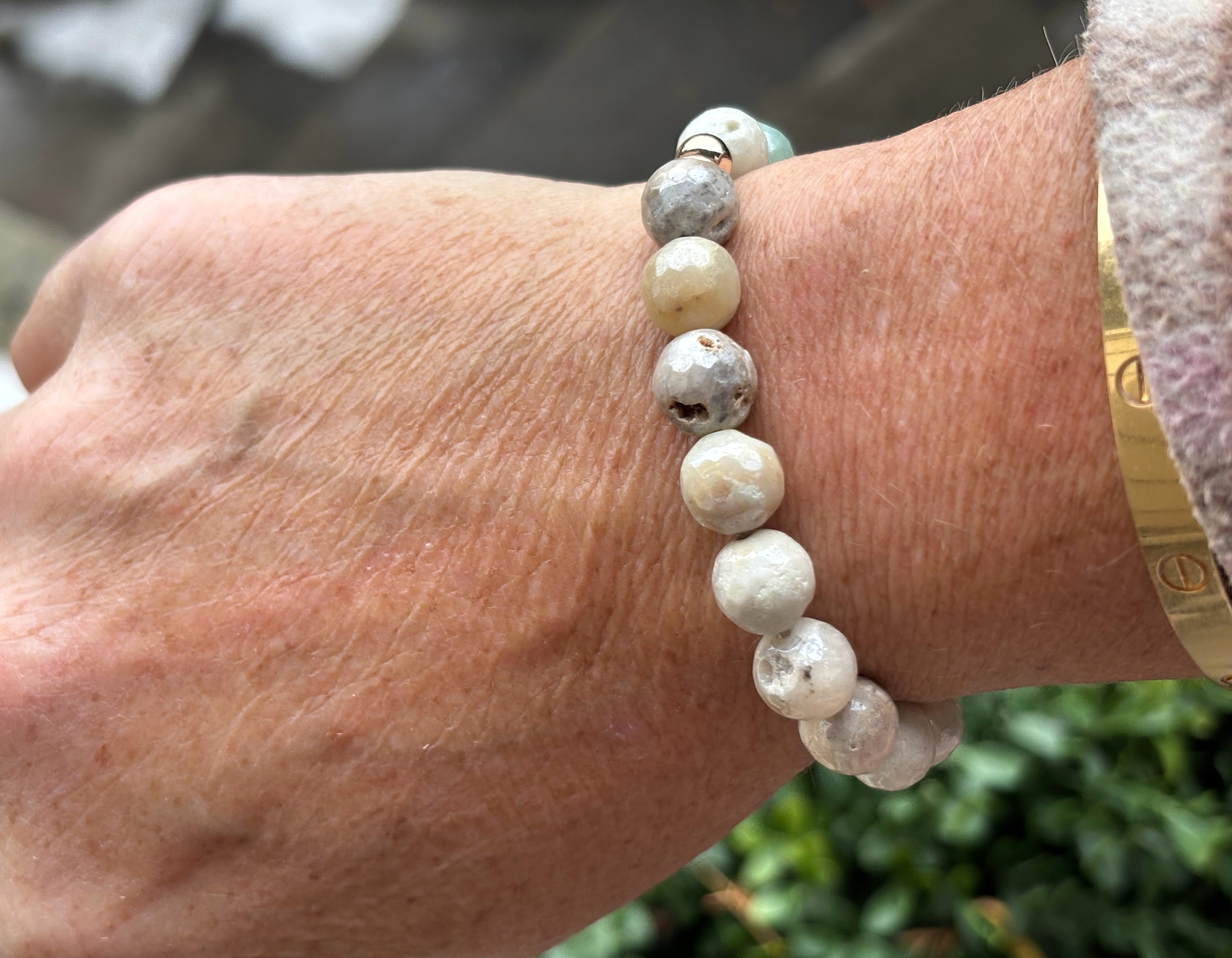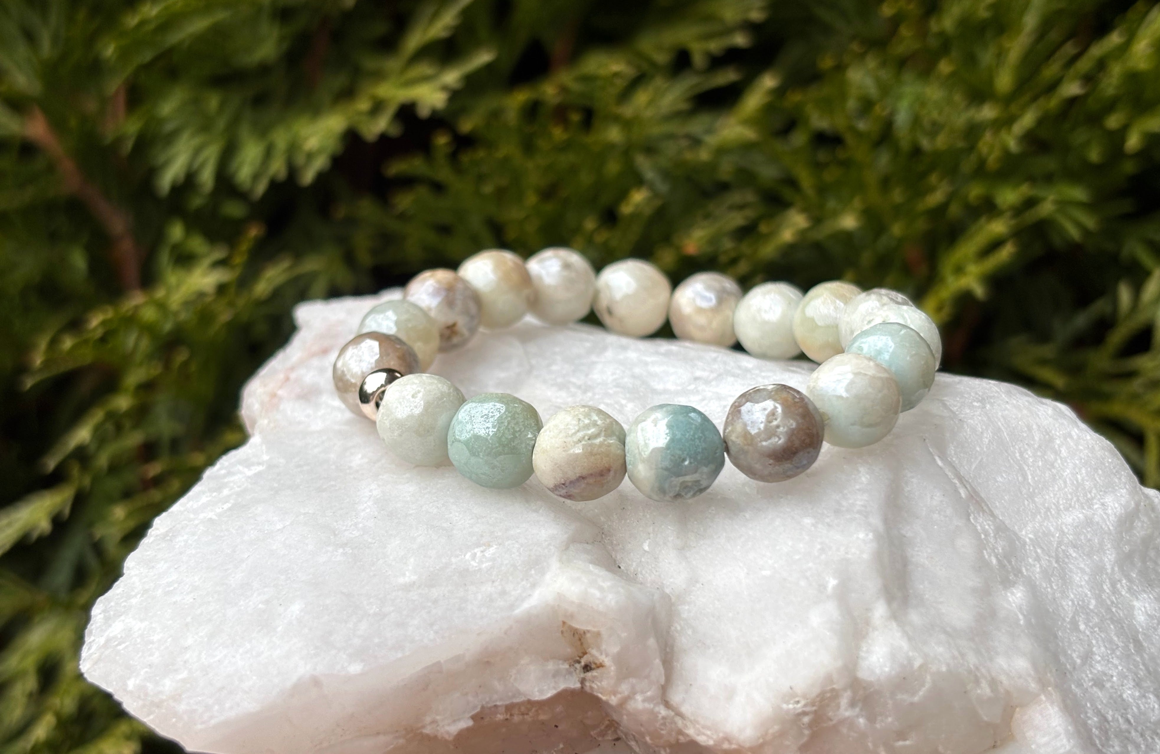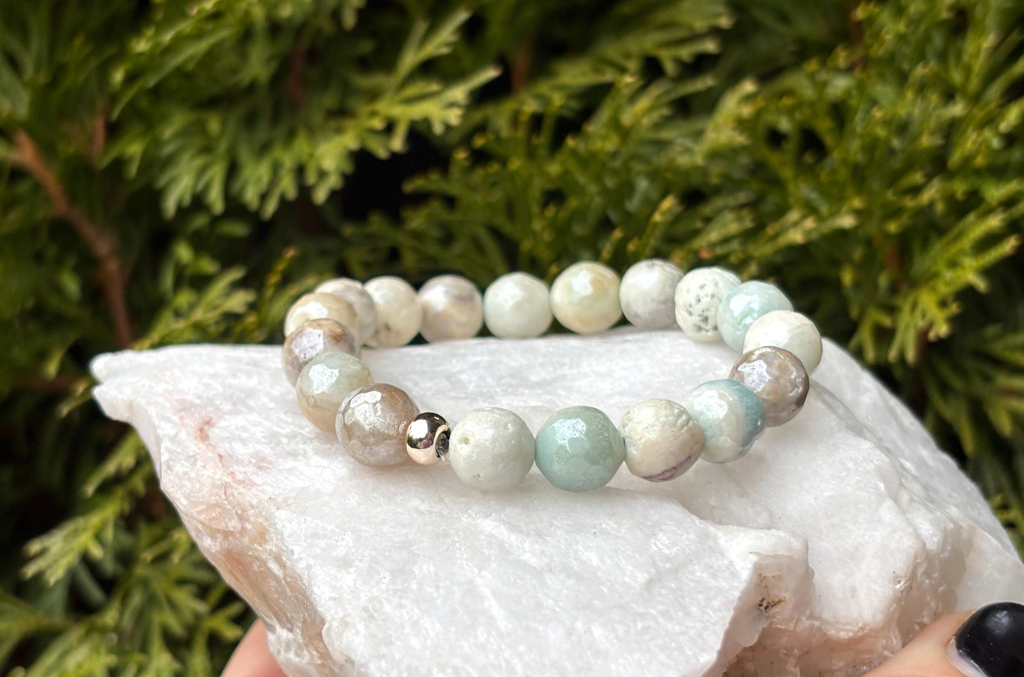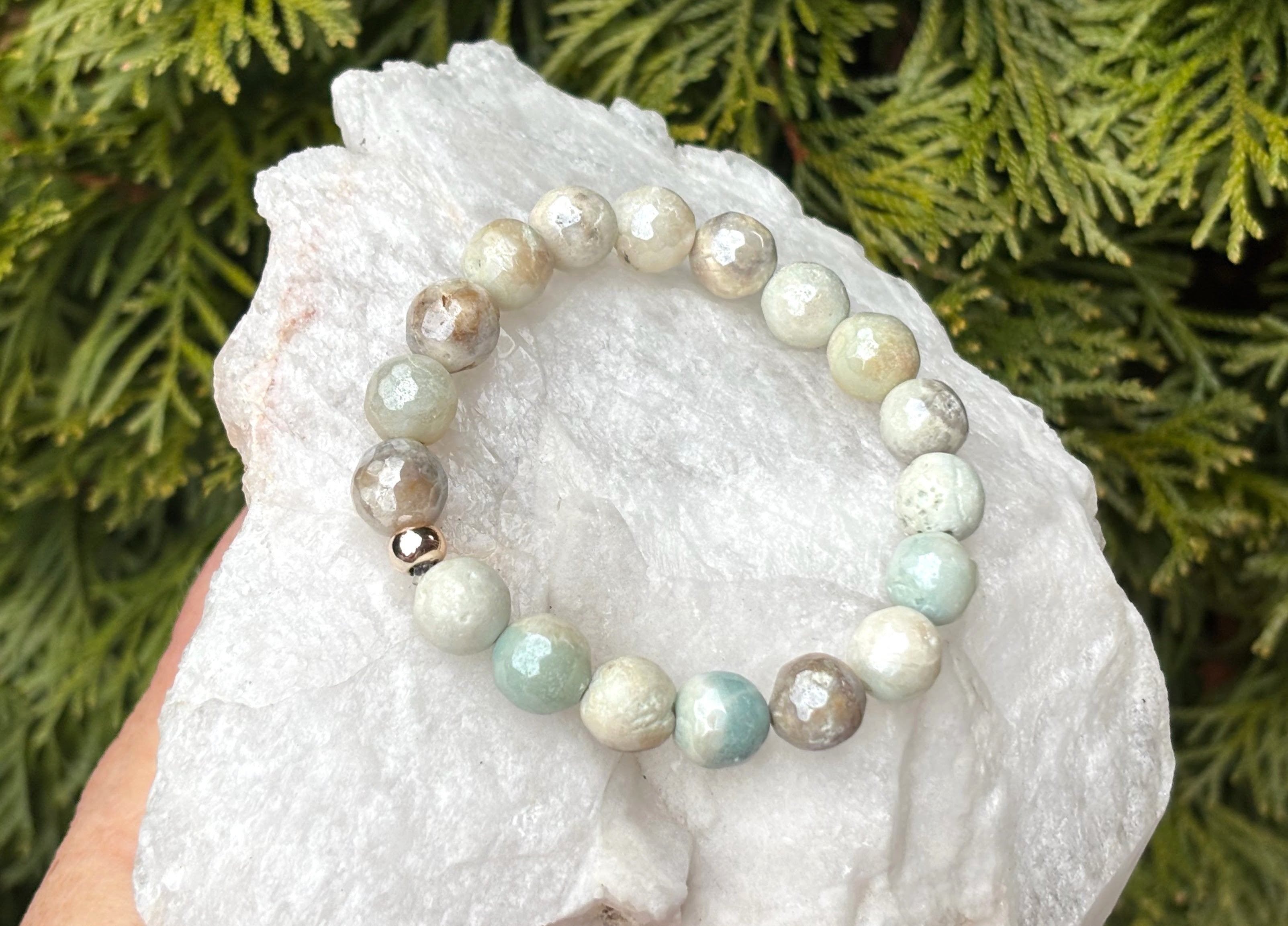 Earthy Agate beads meet a subtle electroplated accent, creating a bracelet that feels both organic and luminous. Each stone carries its own soft variations—misty greens, creamy neutrals, and natural inclusions—making every piece beautifully one of a kind.