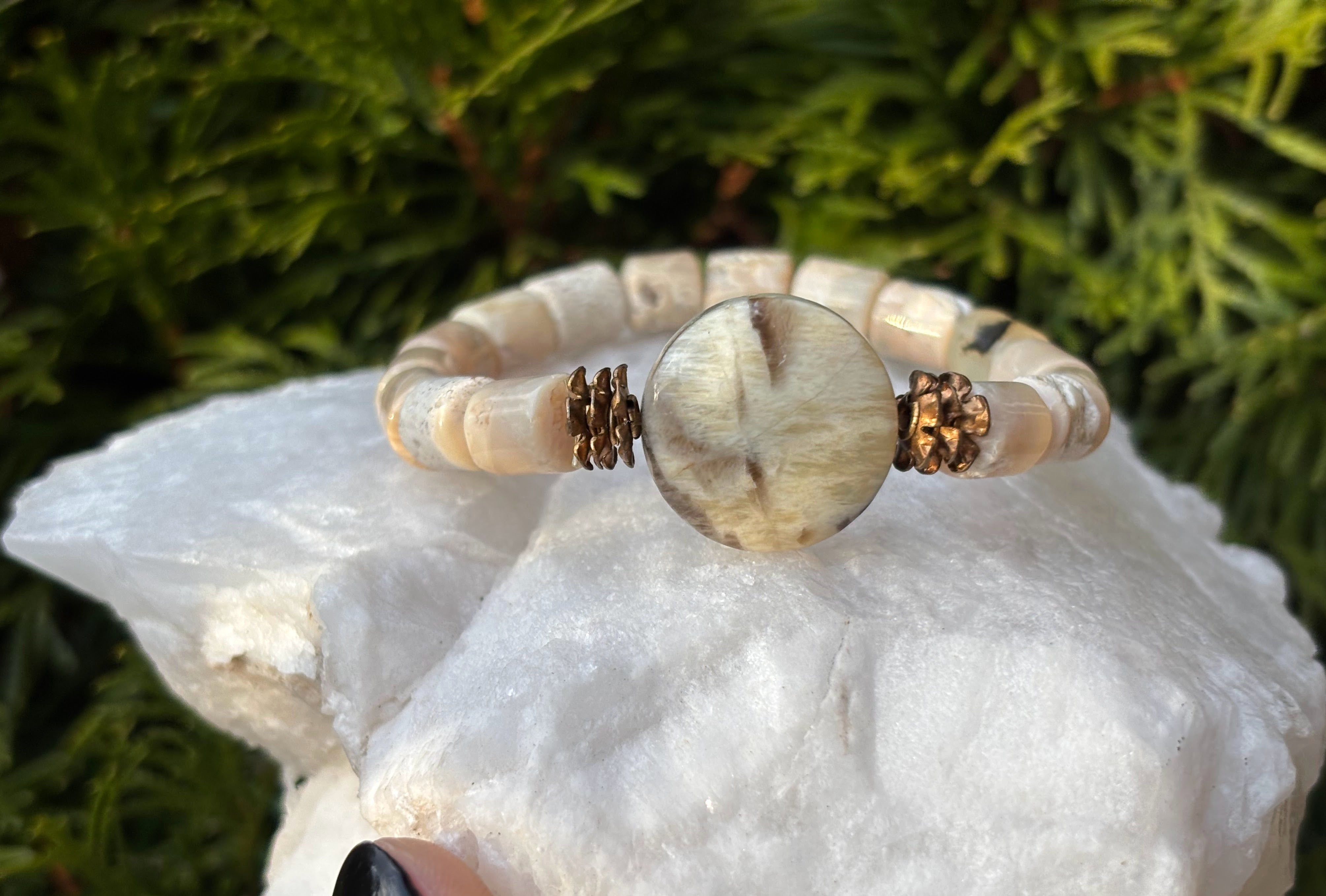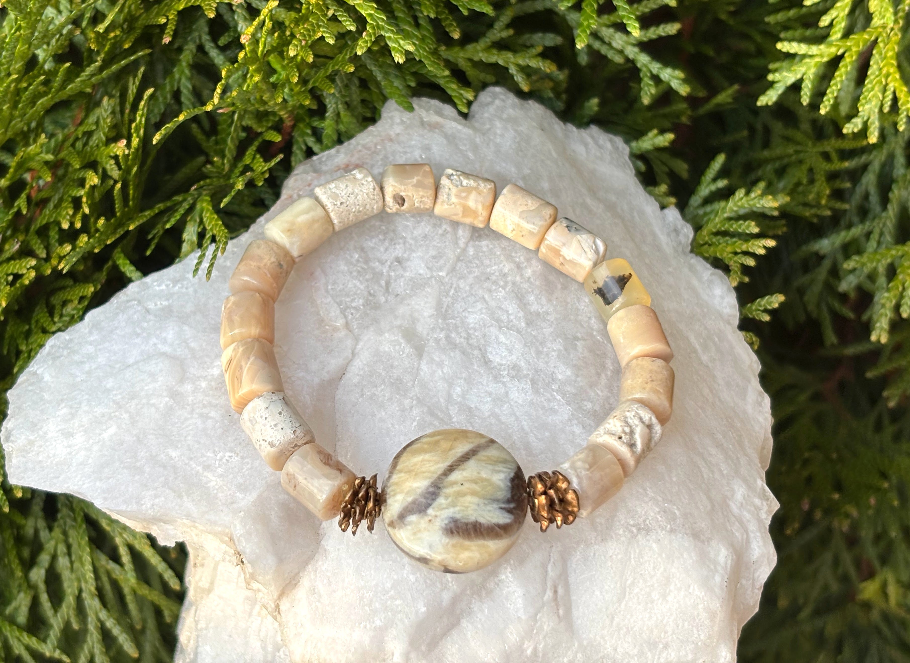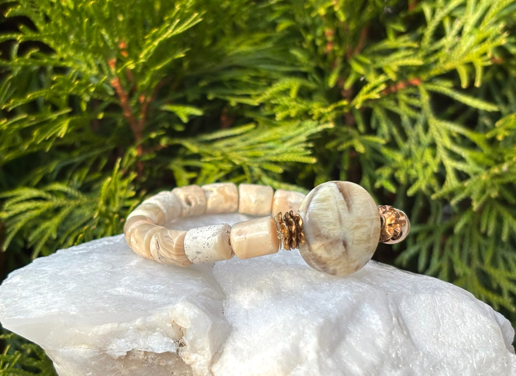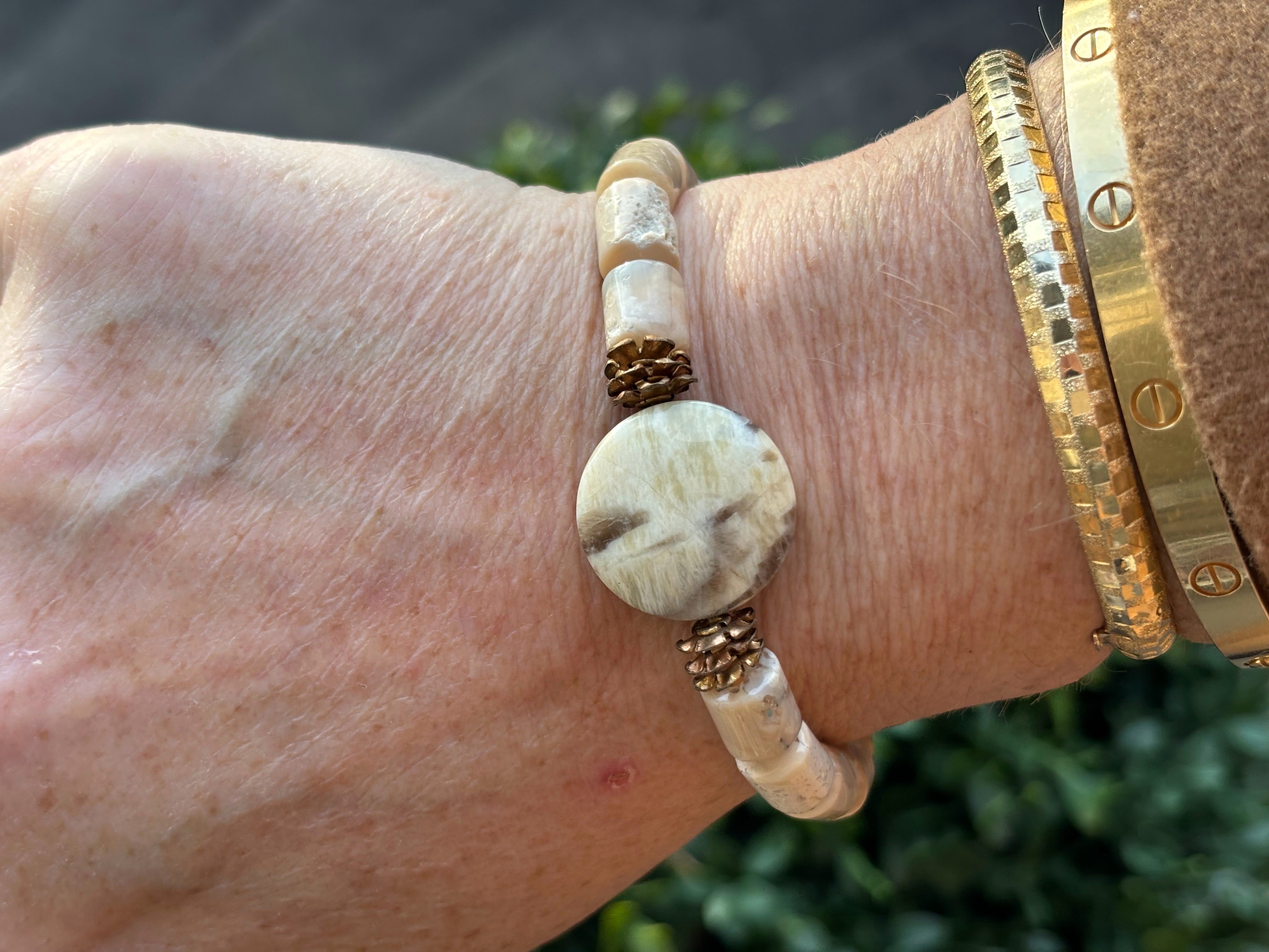 Graphic Feldspar and vintage fossilized Agate beads, vintage brass rhinestone backing serve as accents. Currently this is my favourite bracelet with its Sandy beiges and smoky browns.