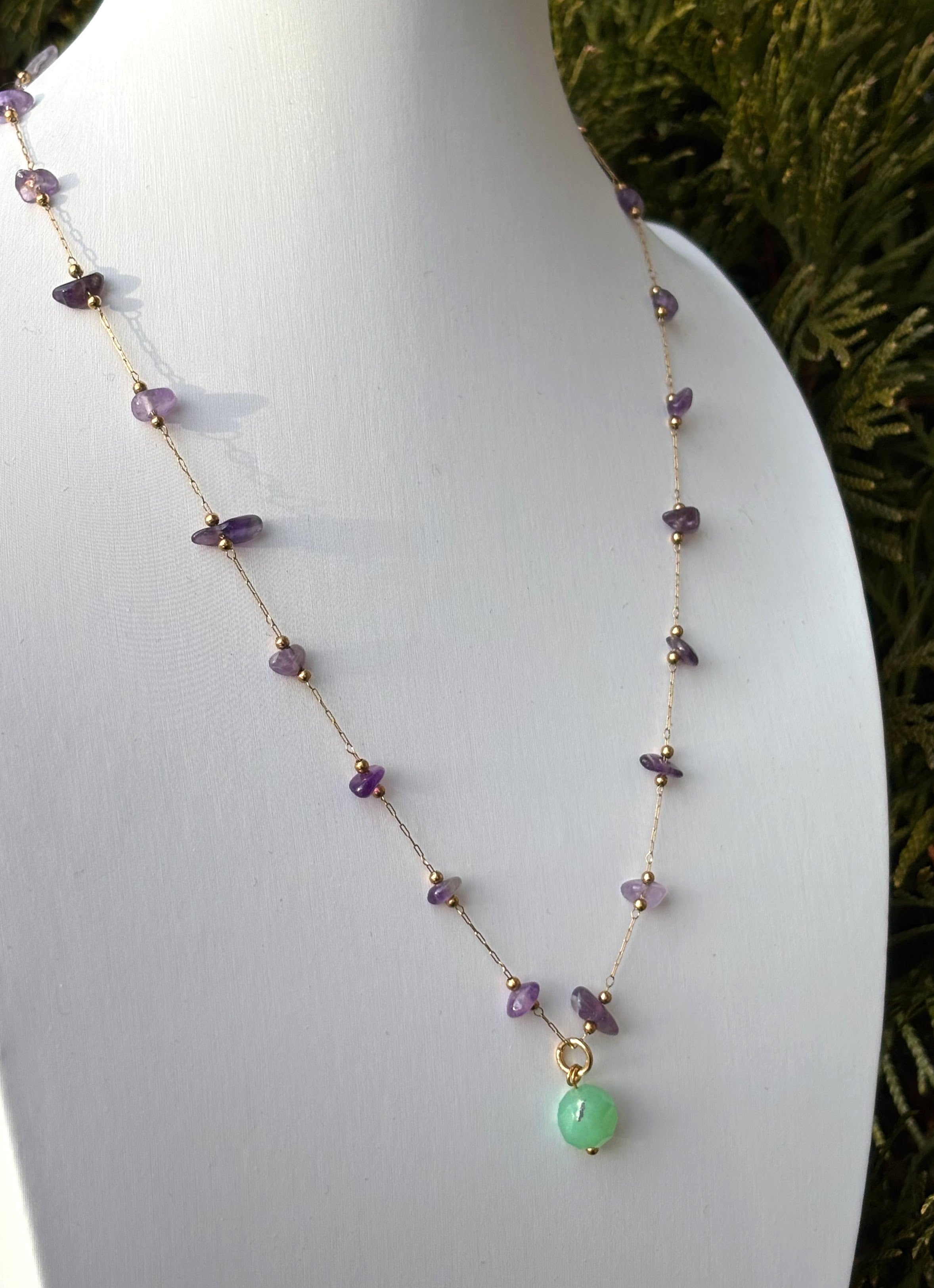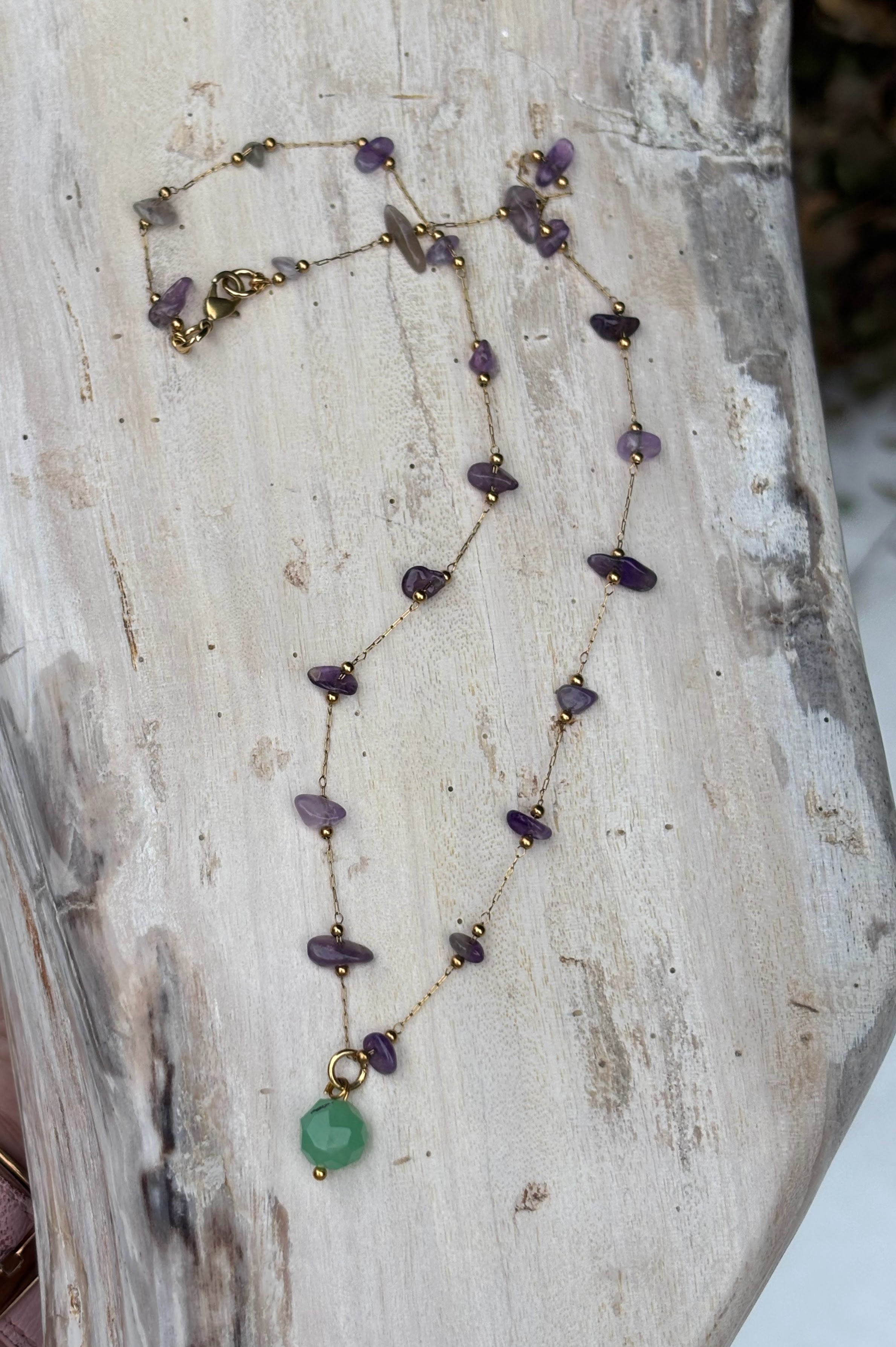 Delicate amethyst gemstones flow along a fine gold chain, leading to a radiant chrysoprase drop that glows softly at the heart. This necklace captures the energy of fresh beginnings, emotional clarity, and gentle transformation — a wearable reminder to bloom into your most aligned self.