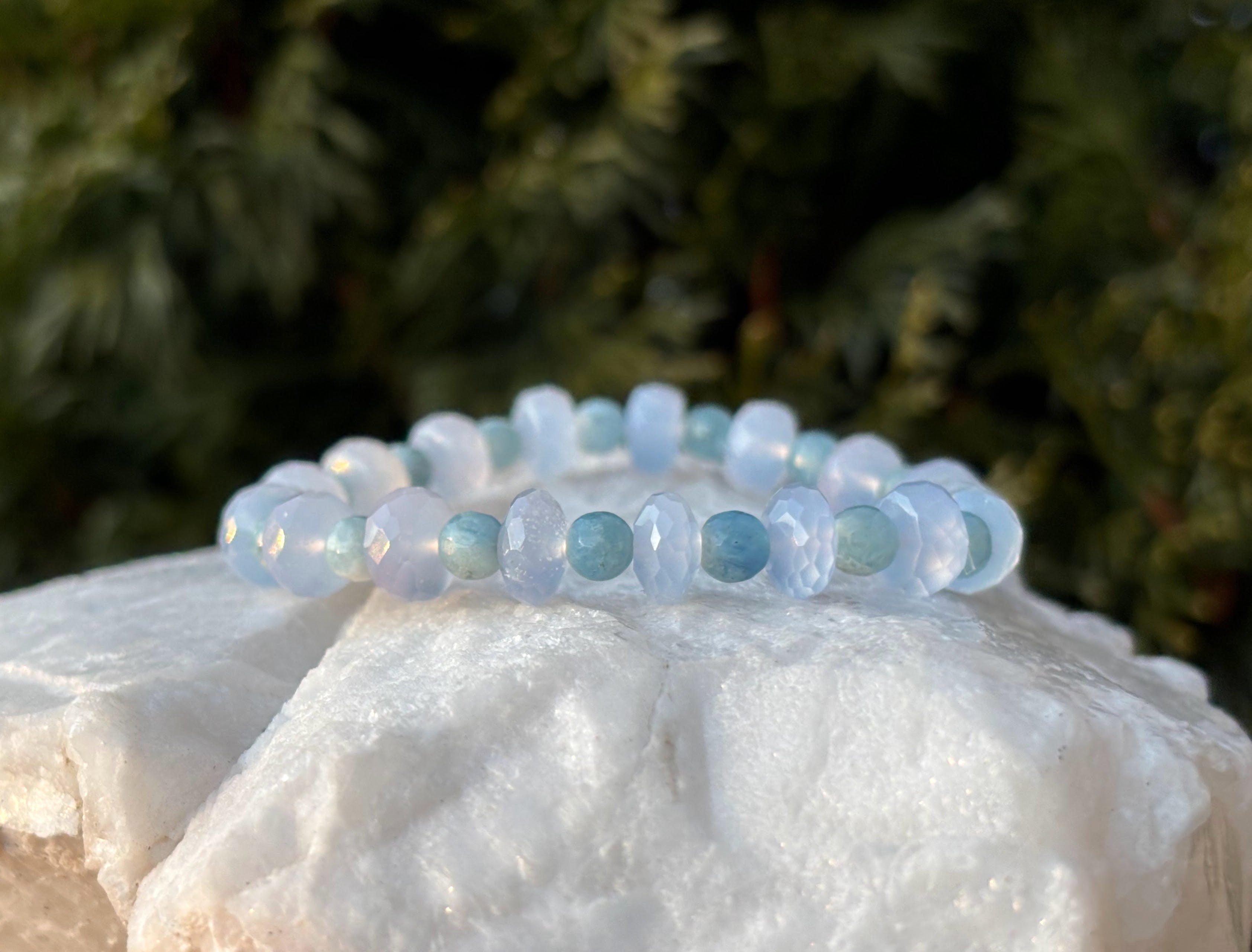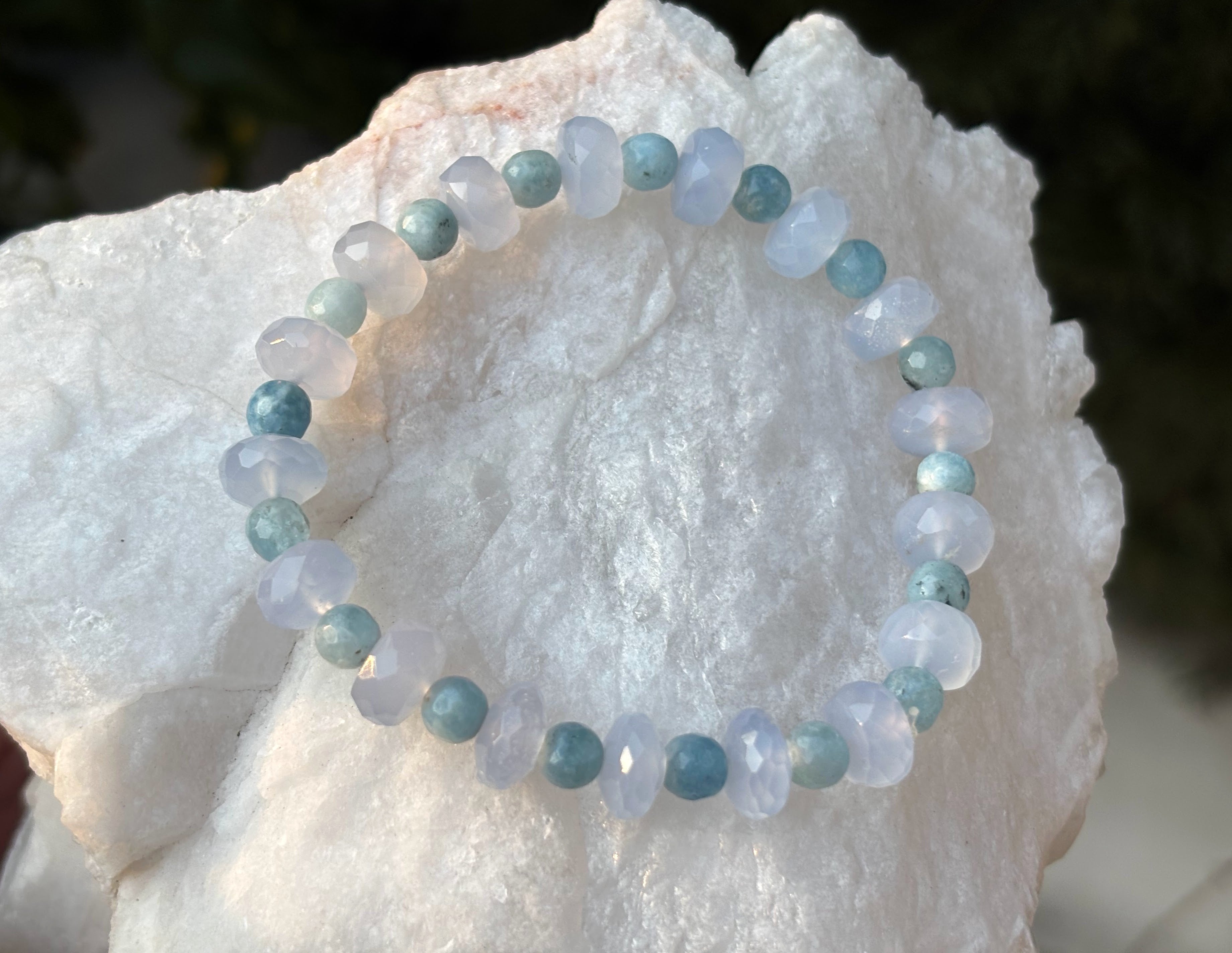 Soft as sea foam and luminous as morning light, the Ocean Whisper Bracelet blends calming aquamarine with soothing blue chalcedony to create a wearable sanctuary of peace and clarity.