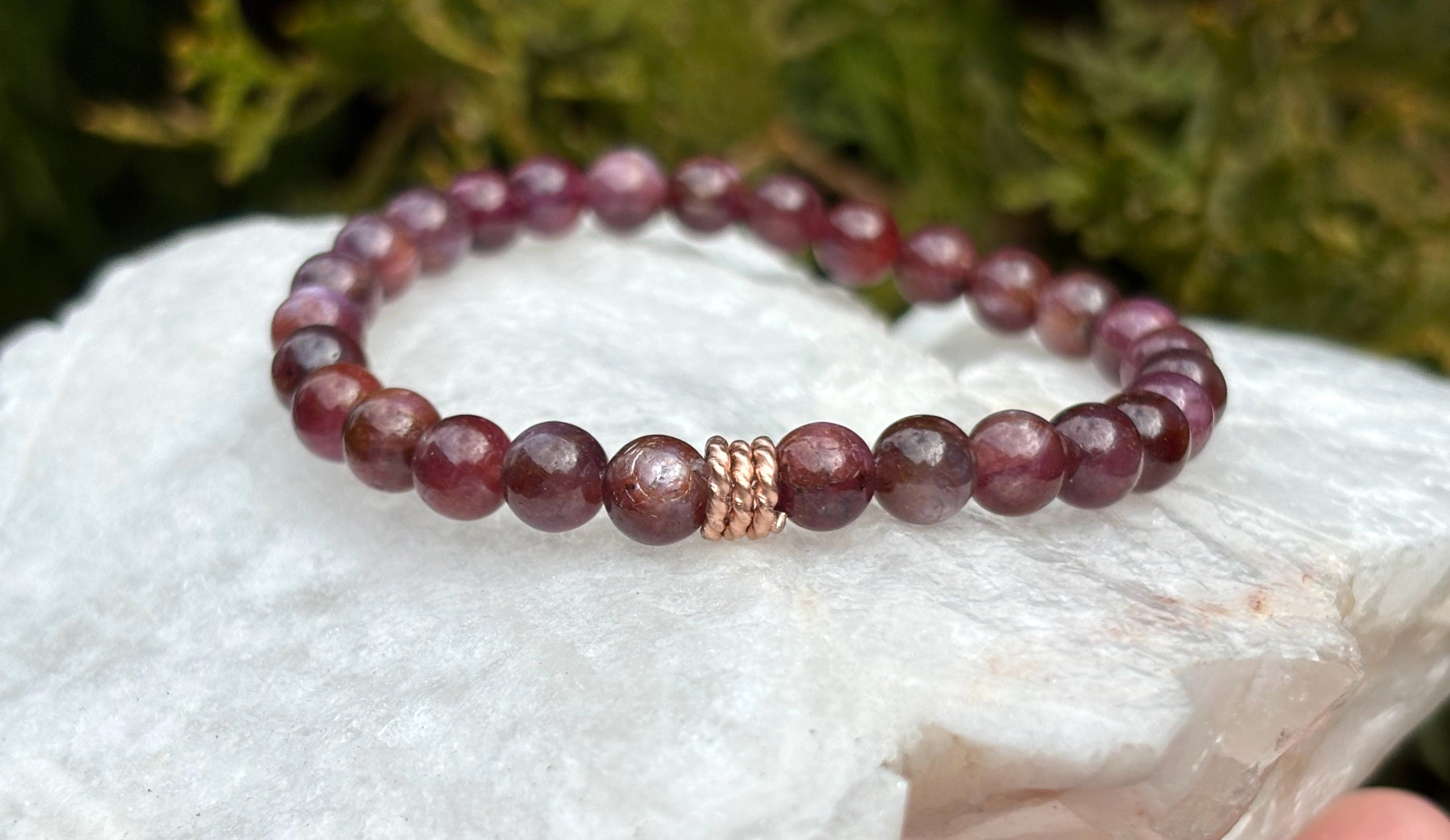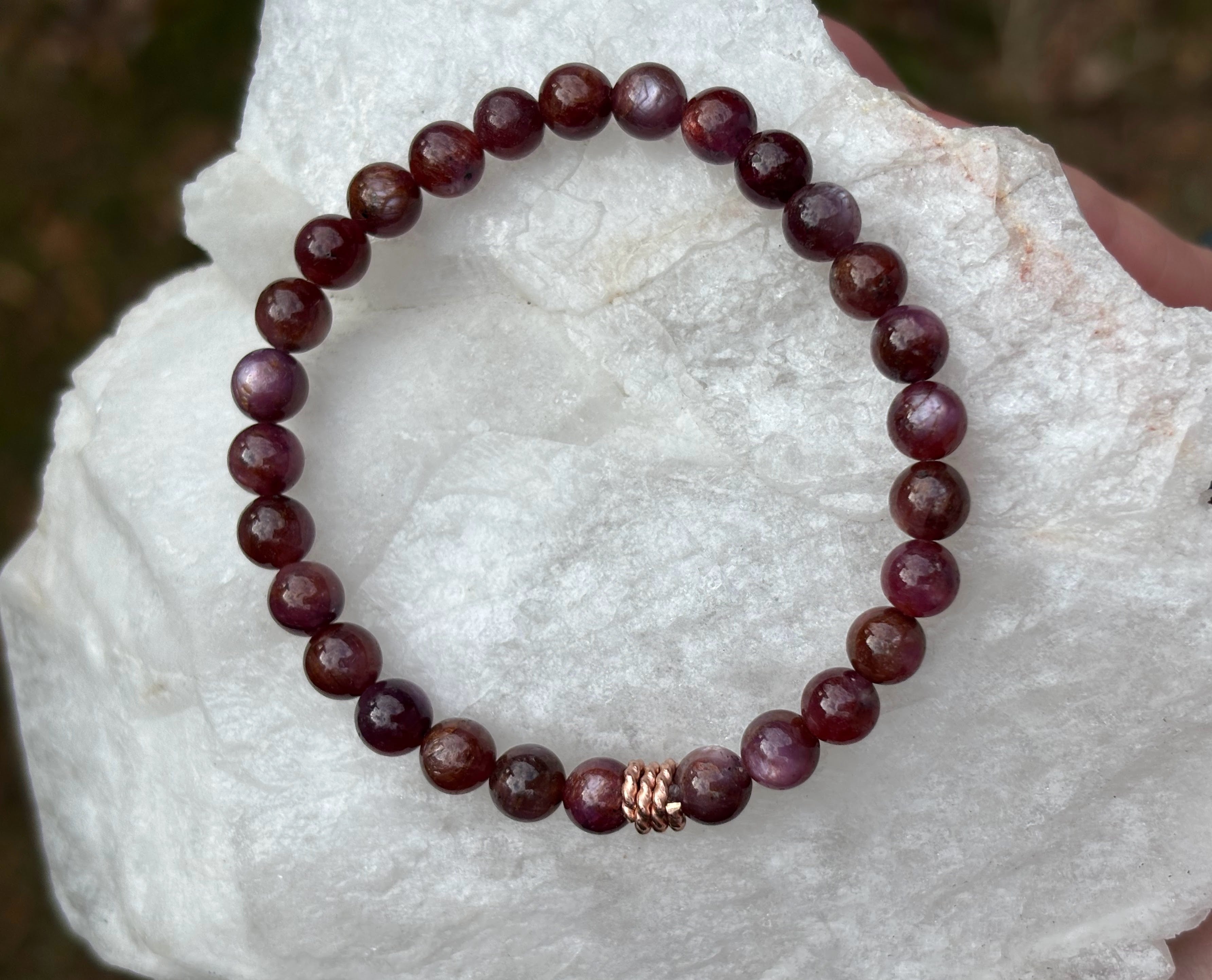 Deep, glowing plum wine-coloured ruby gemstone beads circle the wrist in a rich, glowing band of color, finished with a warm rose-gold-filled accent bead for a soft feminine shimmer.
