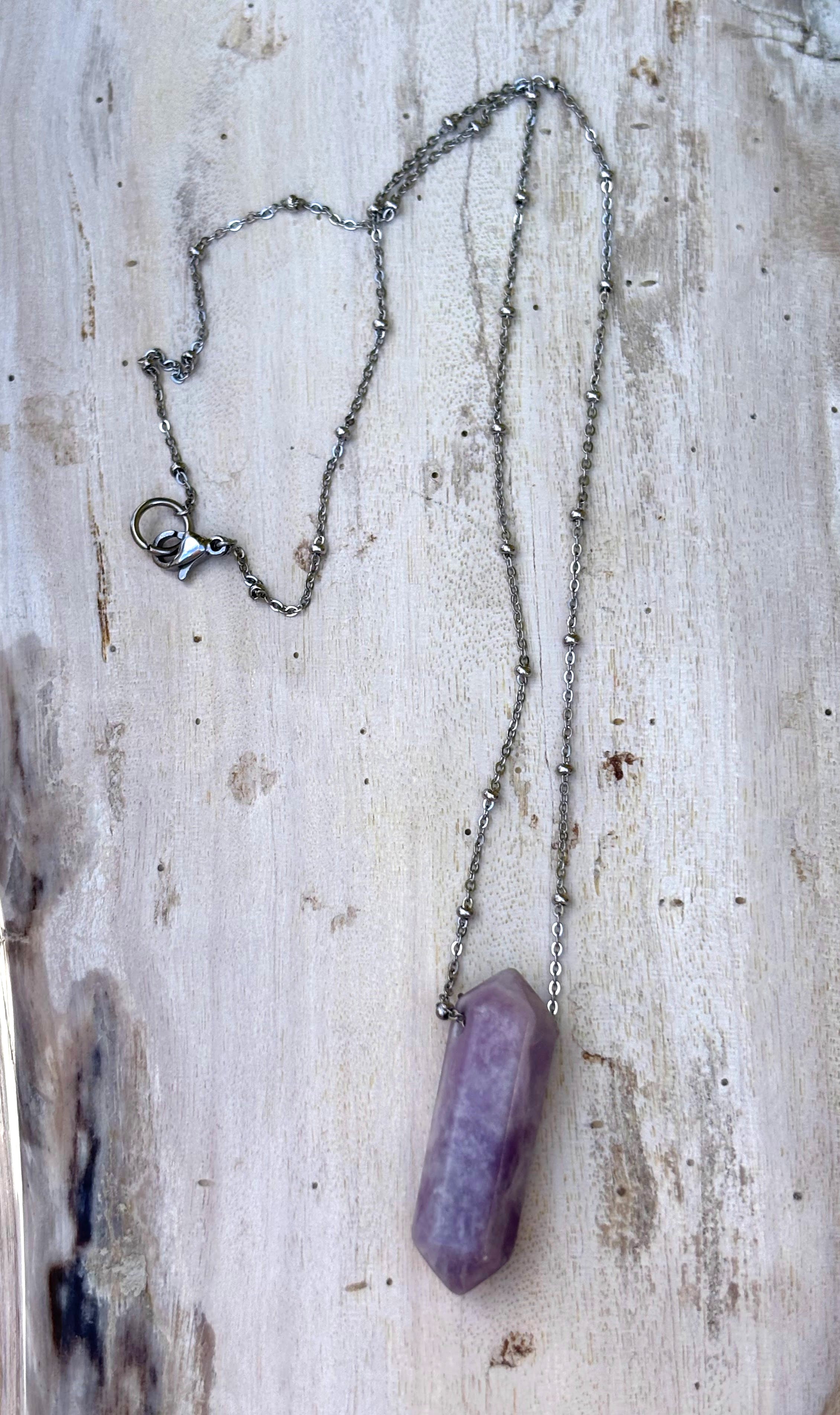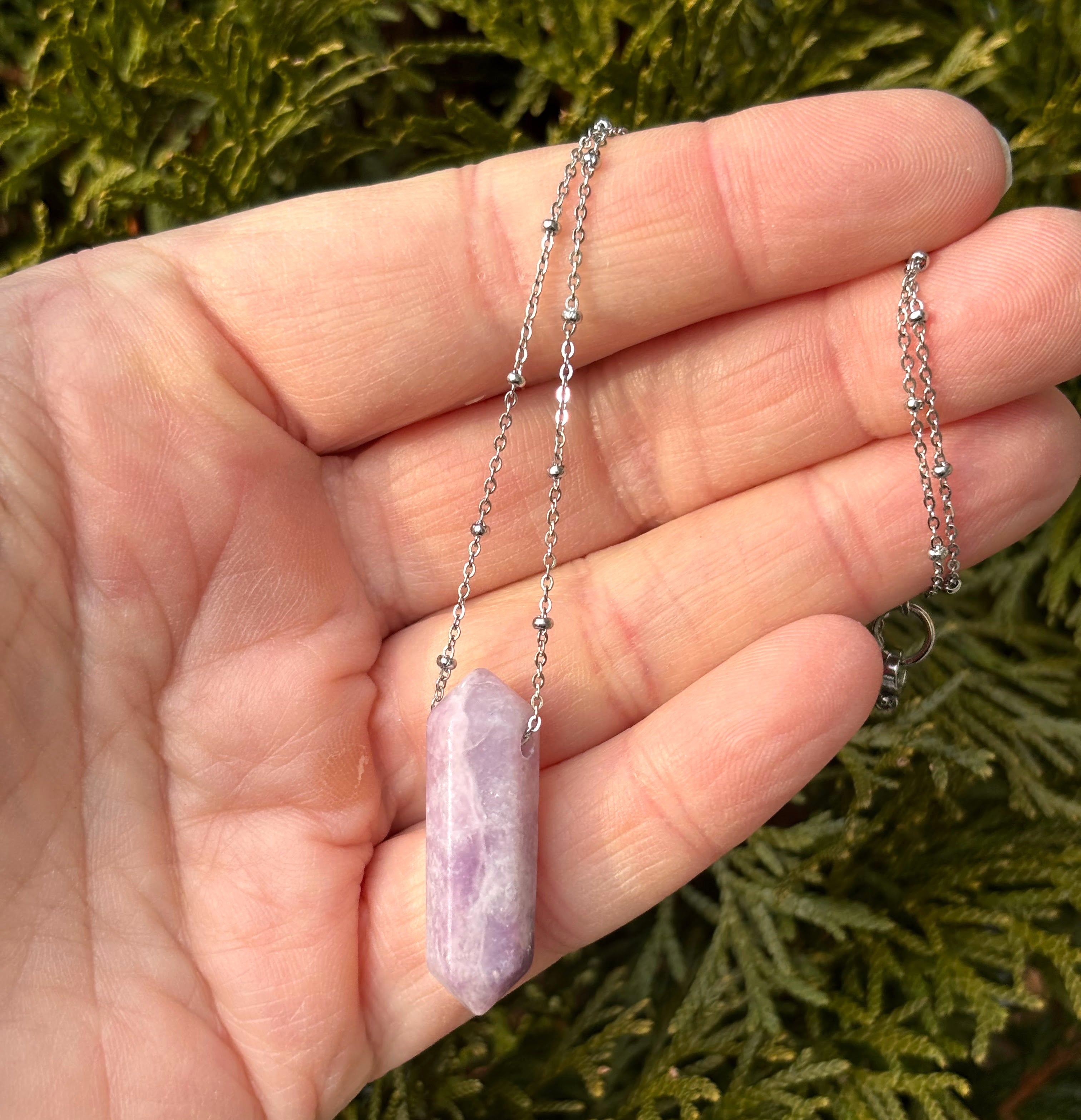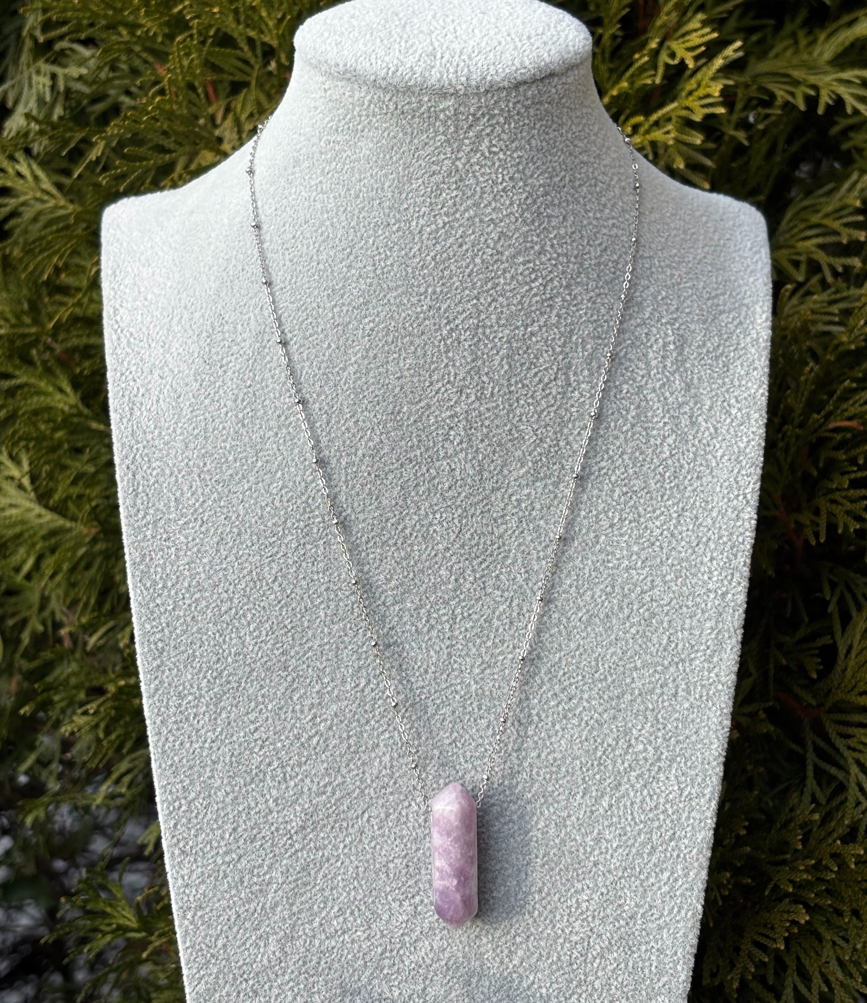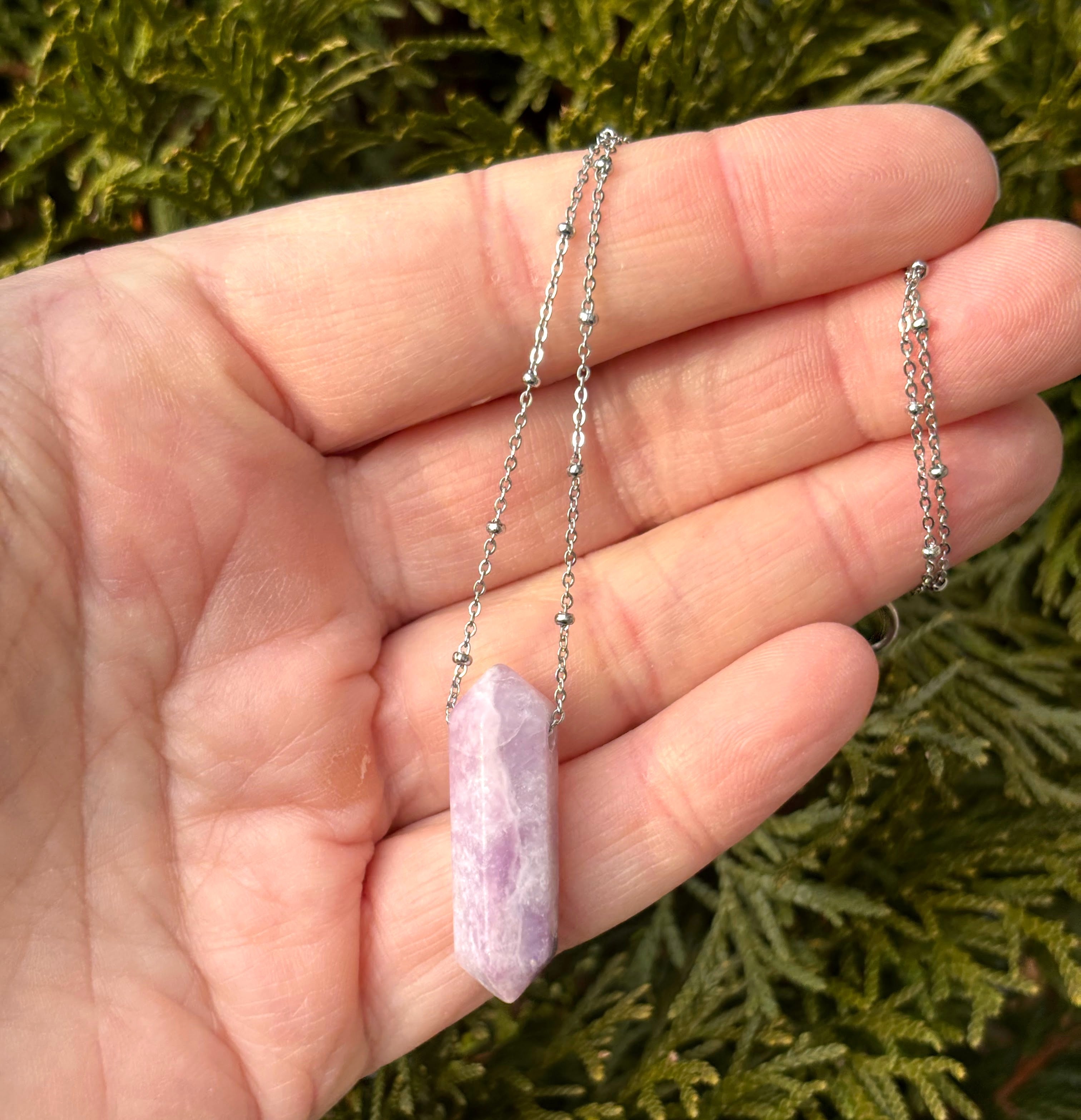 Suspended from a delicate chain, the kunzite crystal rests close to the heart — offering daily support for emotional balance, stress relief, and loving awareness. Each necklace is intentionally crafted to serve as both adornment and energetic talisman.