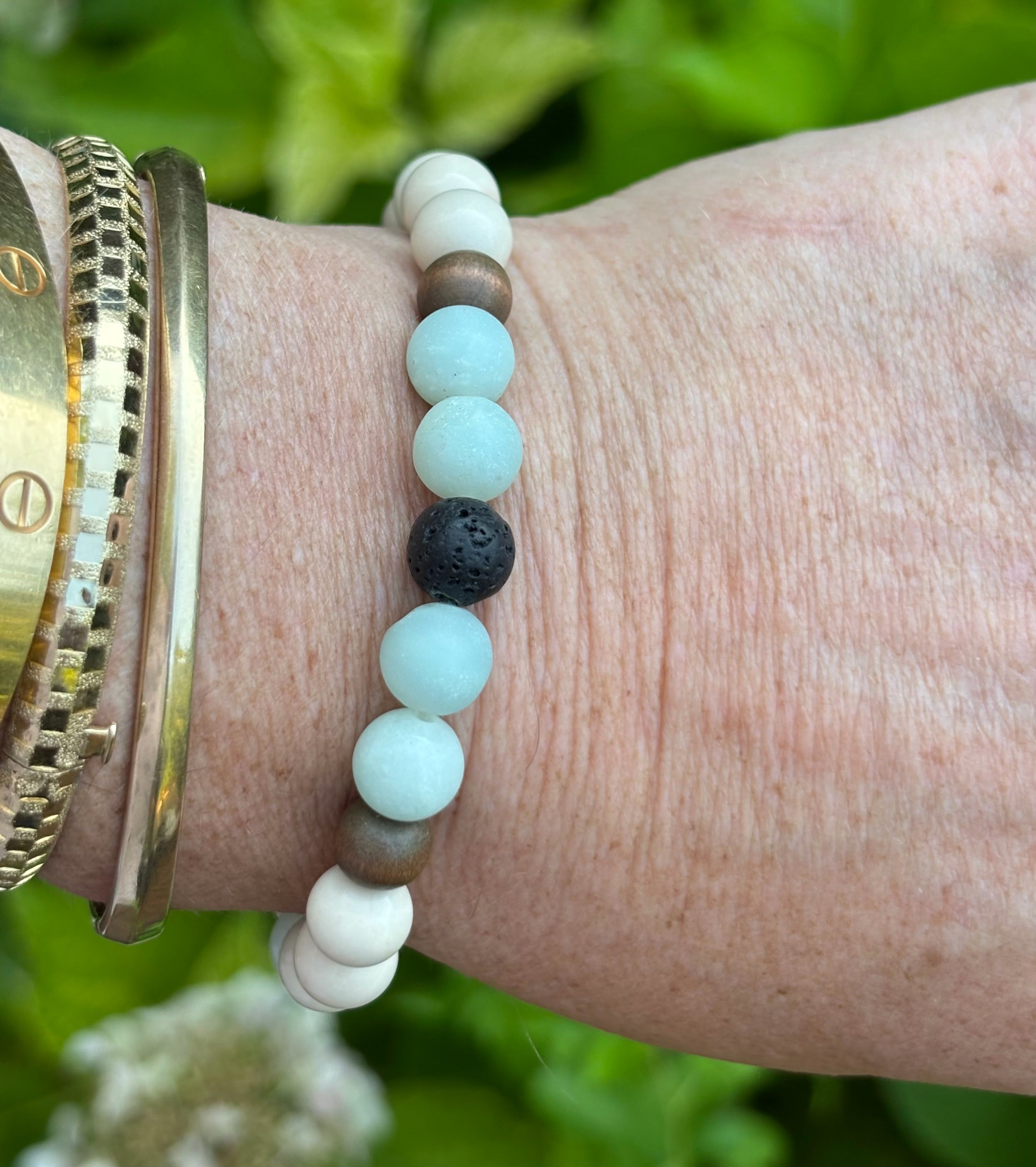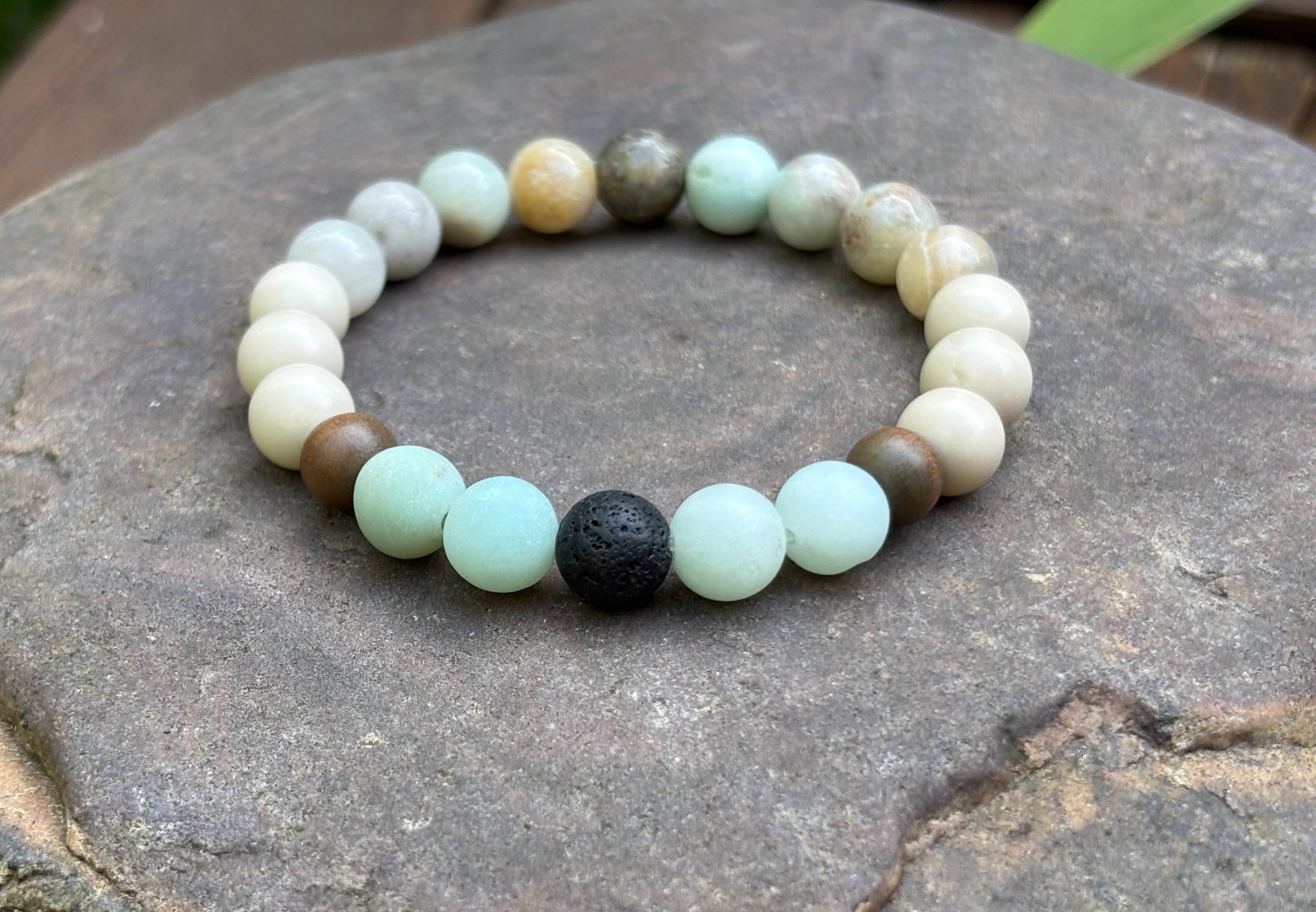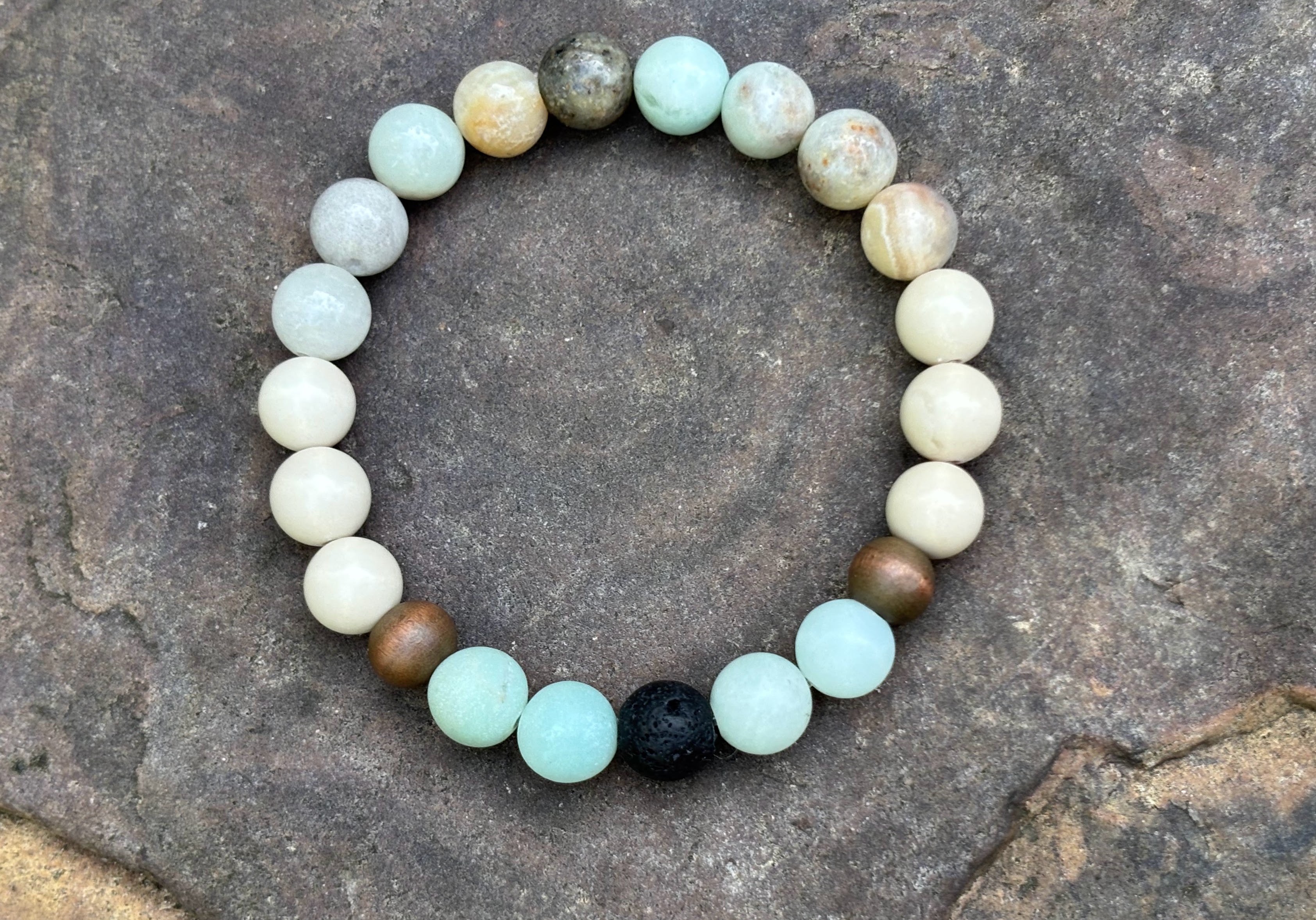 A special bracelet designed to support the here and now. The energy of these stones collectively support living in the moment, being mindful. Specially chosen 8mm stone beads of Amazonite + Fossil with the addition of Lava beads.