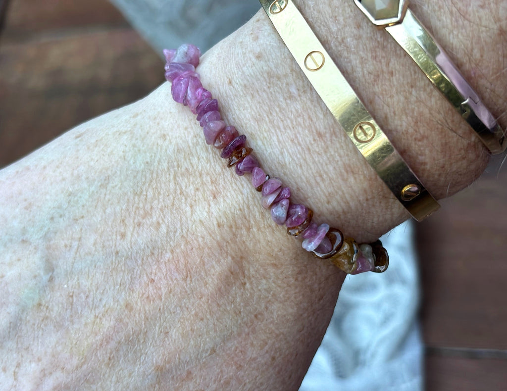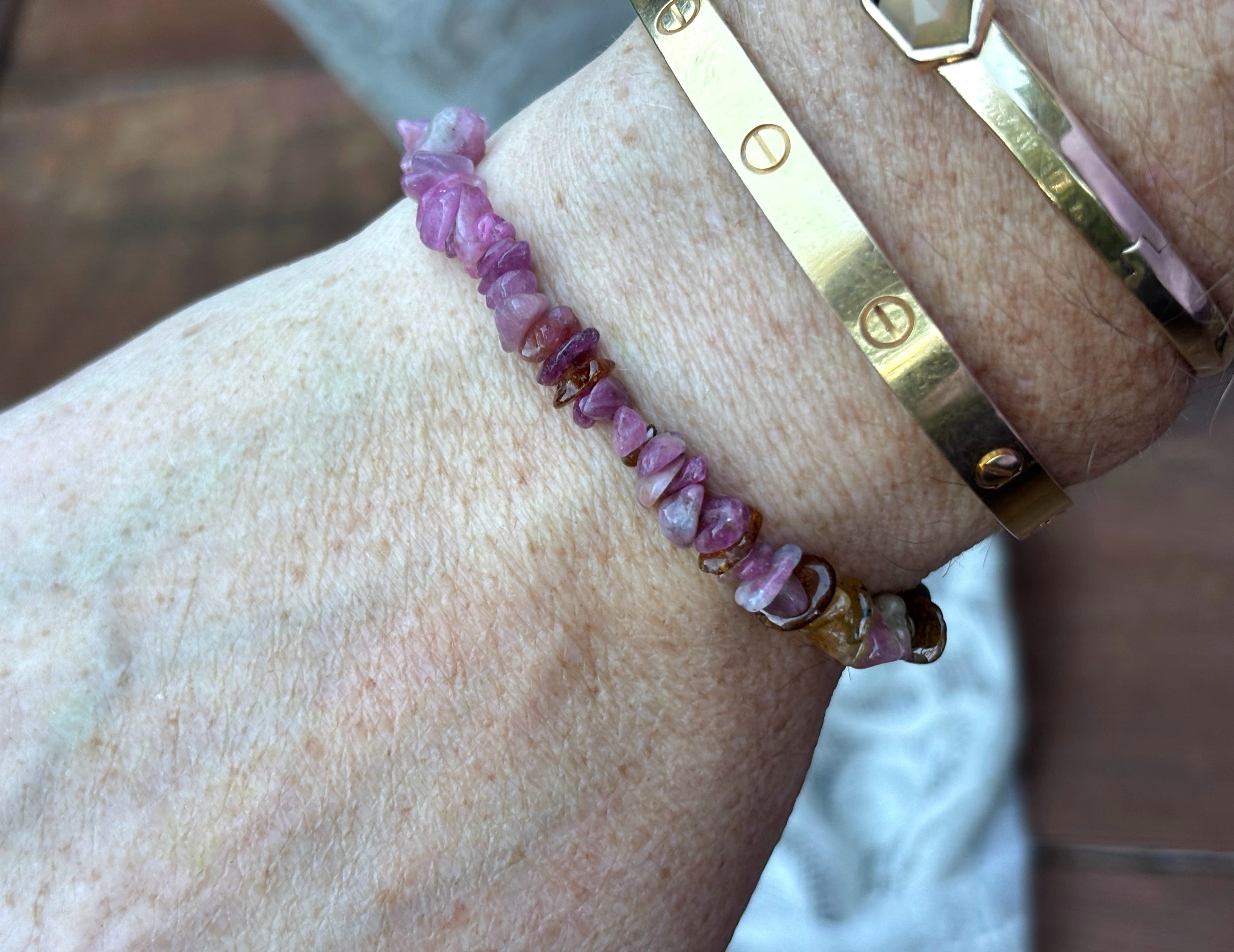 Pink, yellow and green tones of Tourmaline come together to create this easy to wear bracelet.
