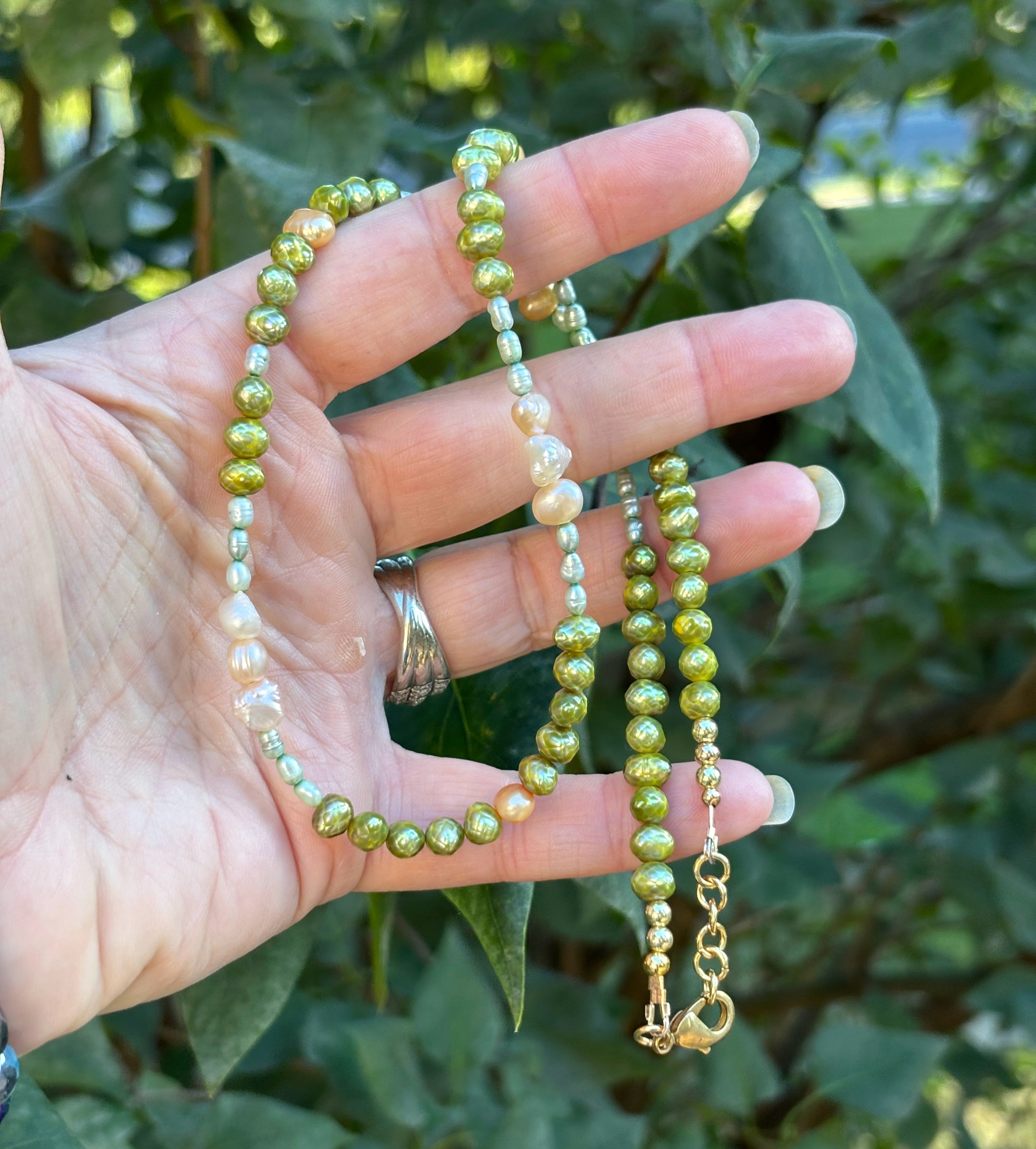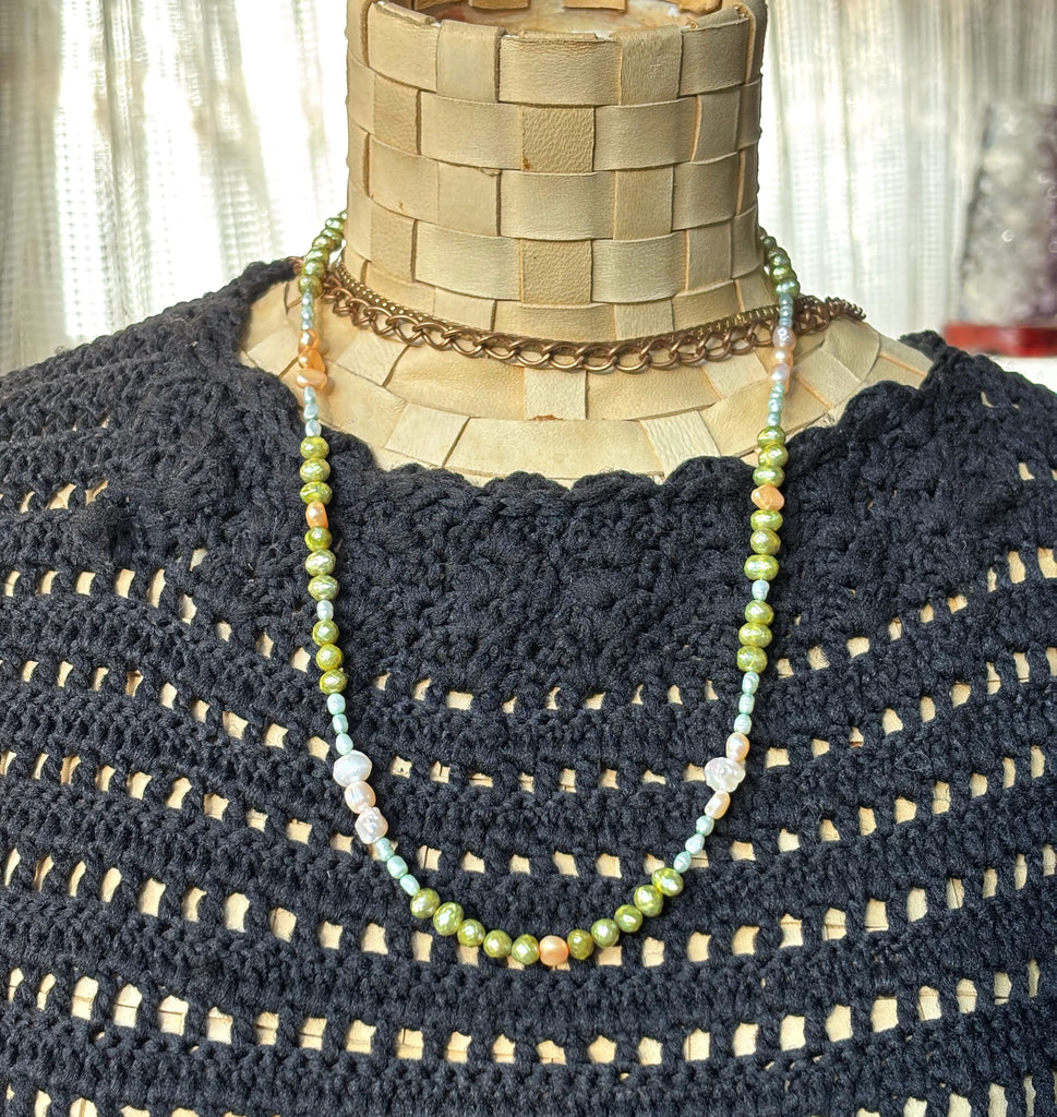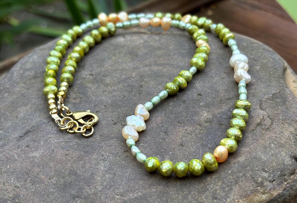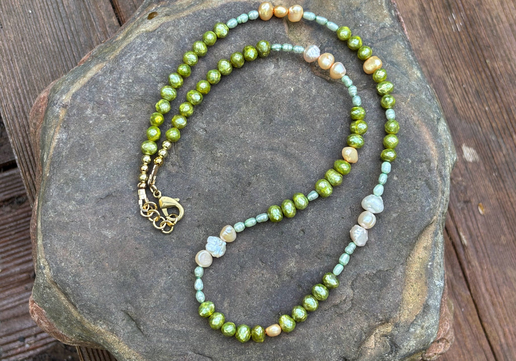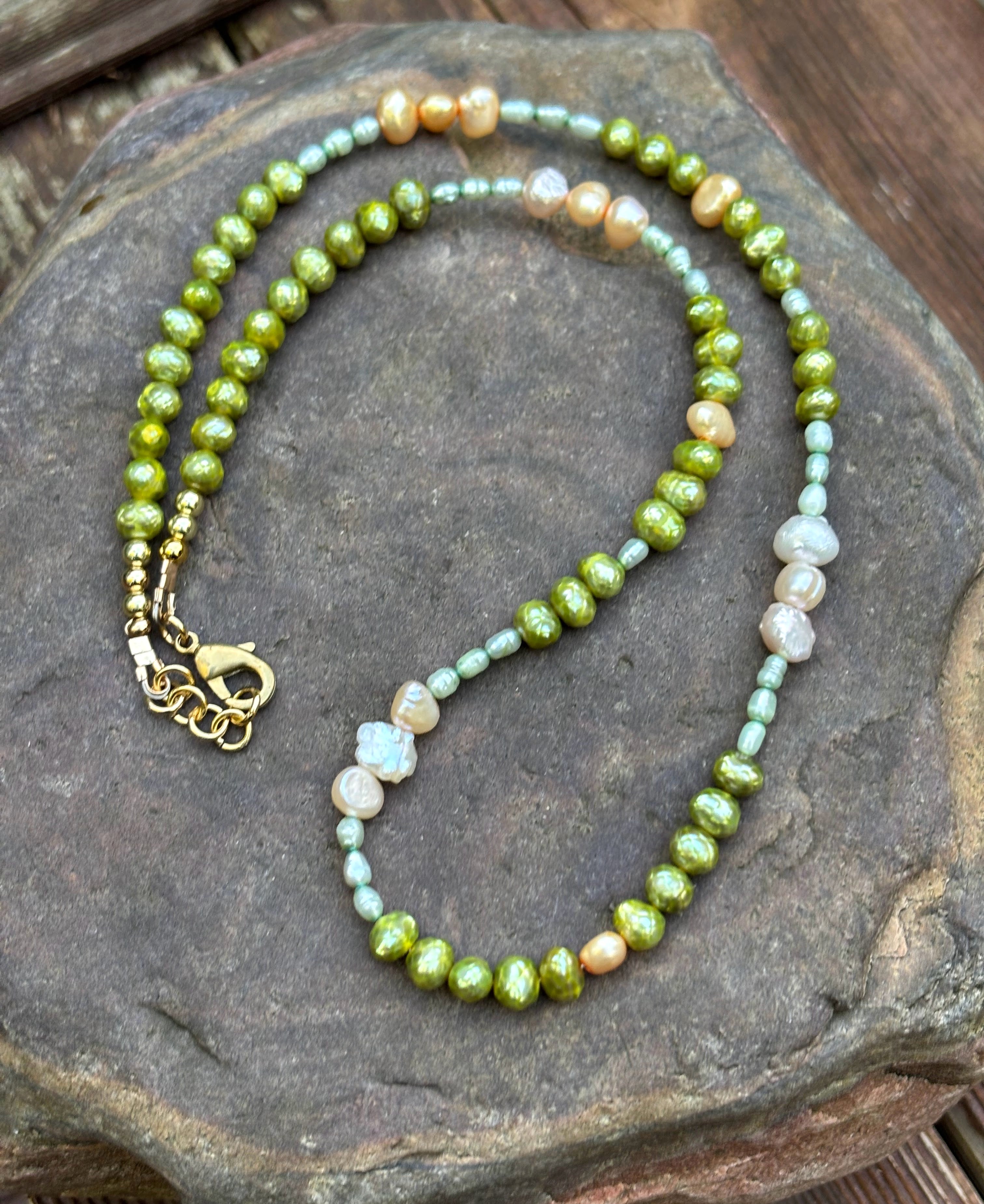 Mid length strand of fresh water pearls in mint green, green, peach, cream and yellow pearls.