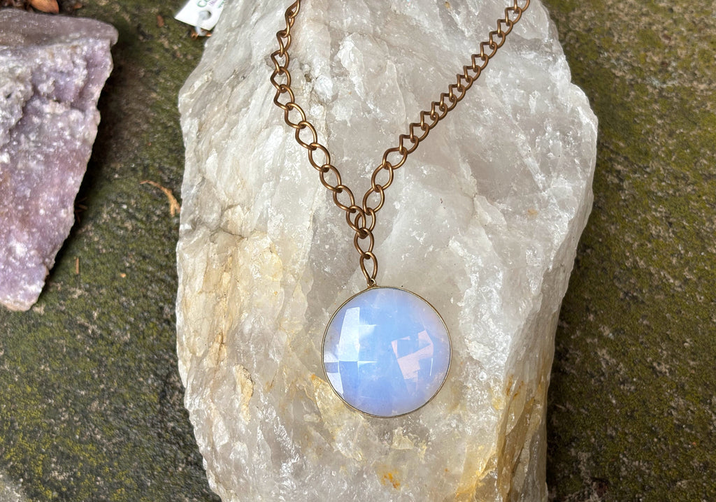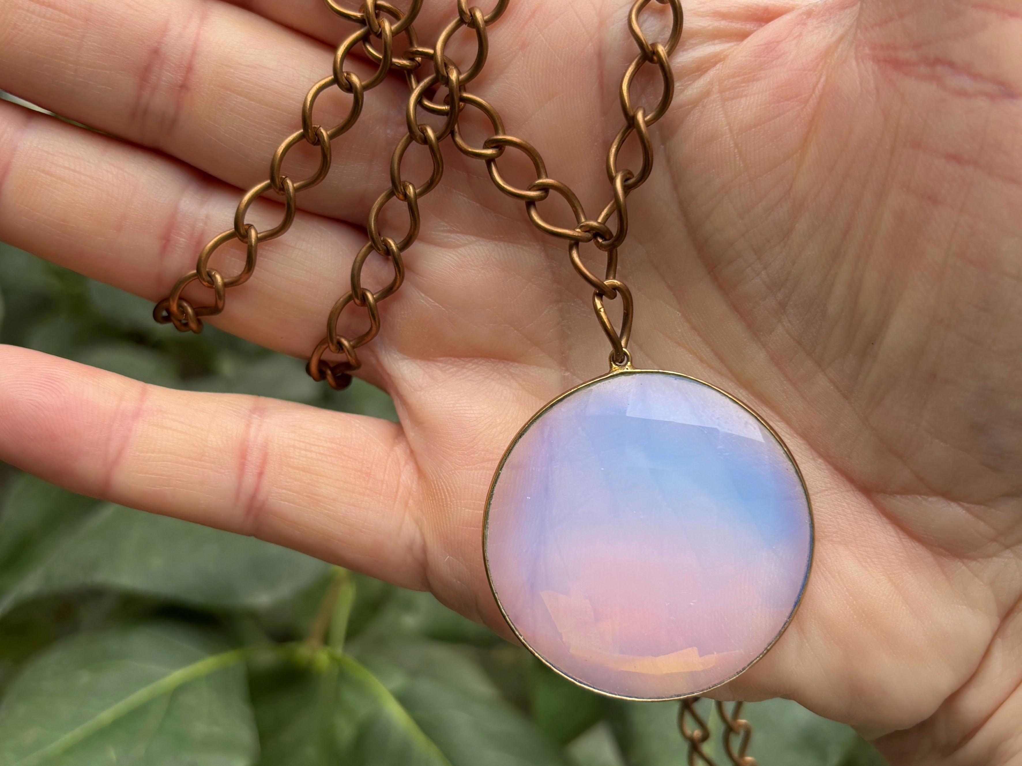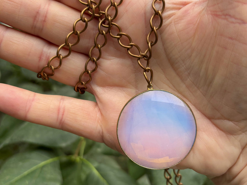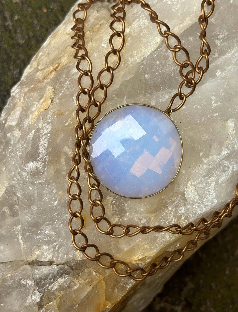 Medallion faceted Opalite necklace. Brass chain, unique statement necklace. Man made Opalite.