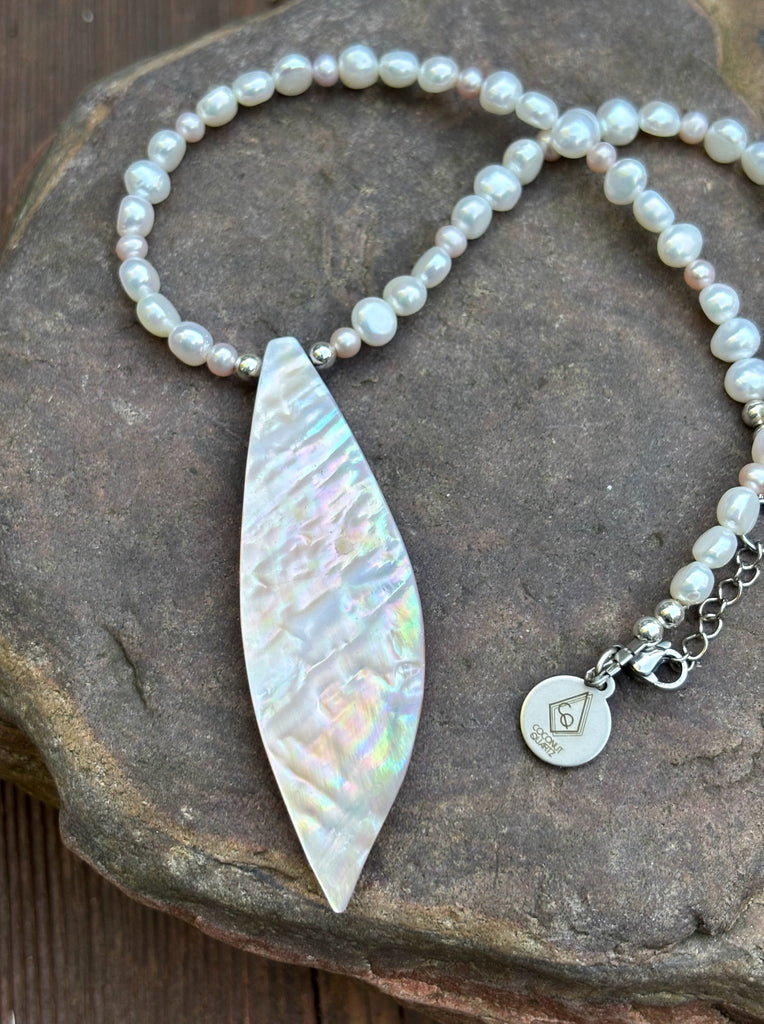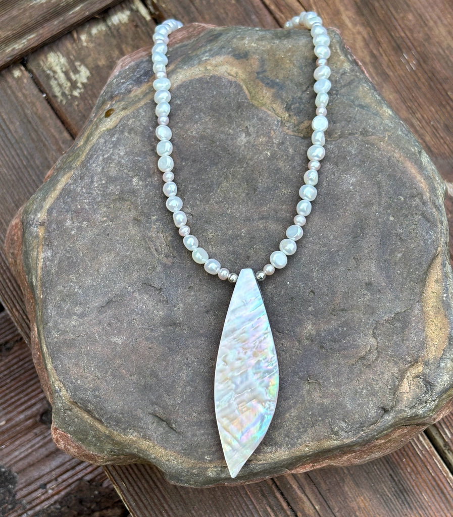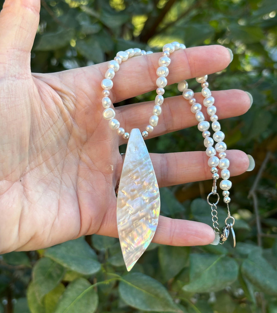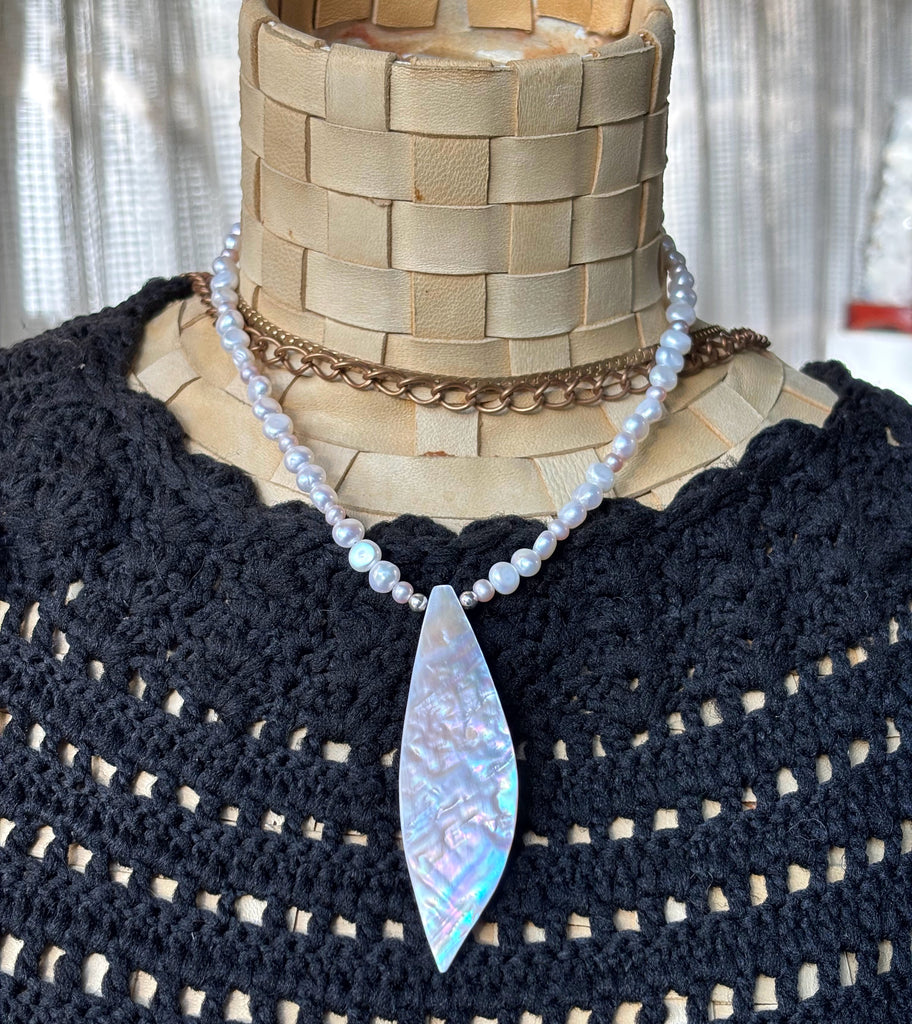 Light pink freshwater pearls mixed with oval pearls. Elaborate Sea Petal shell pendant.