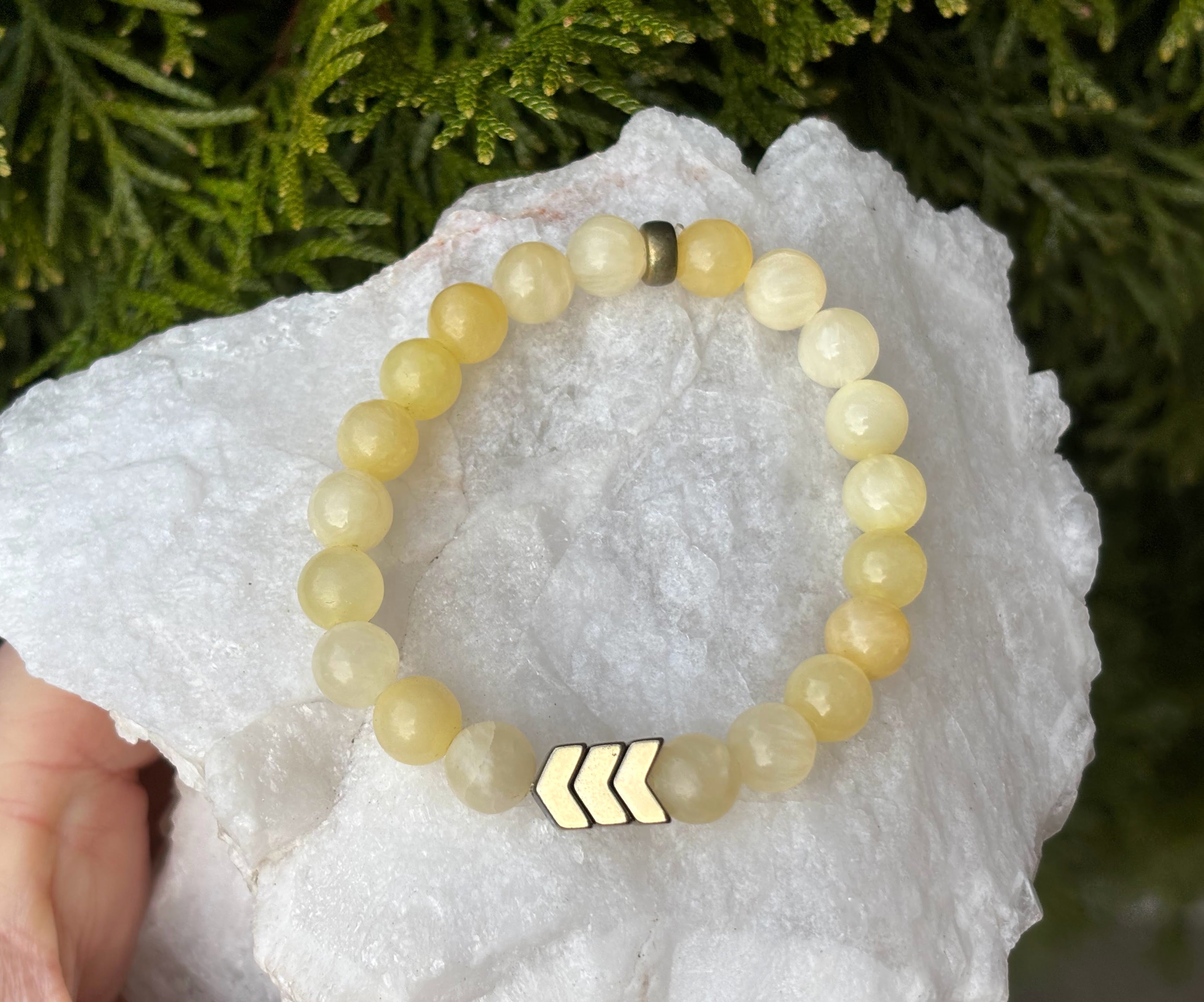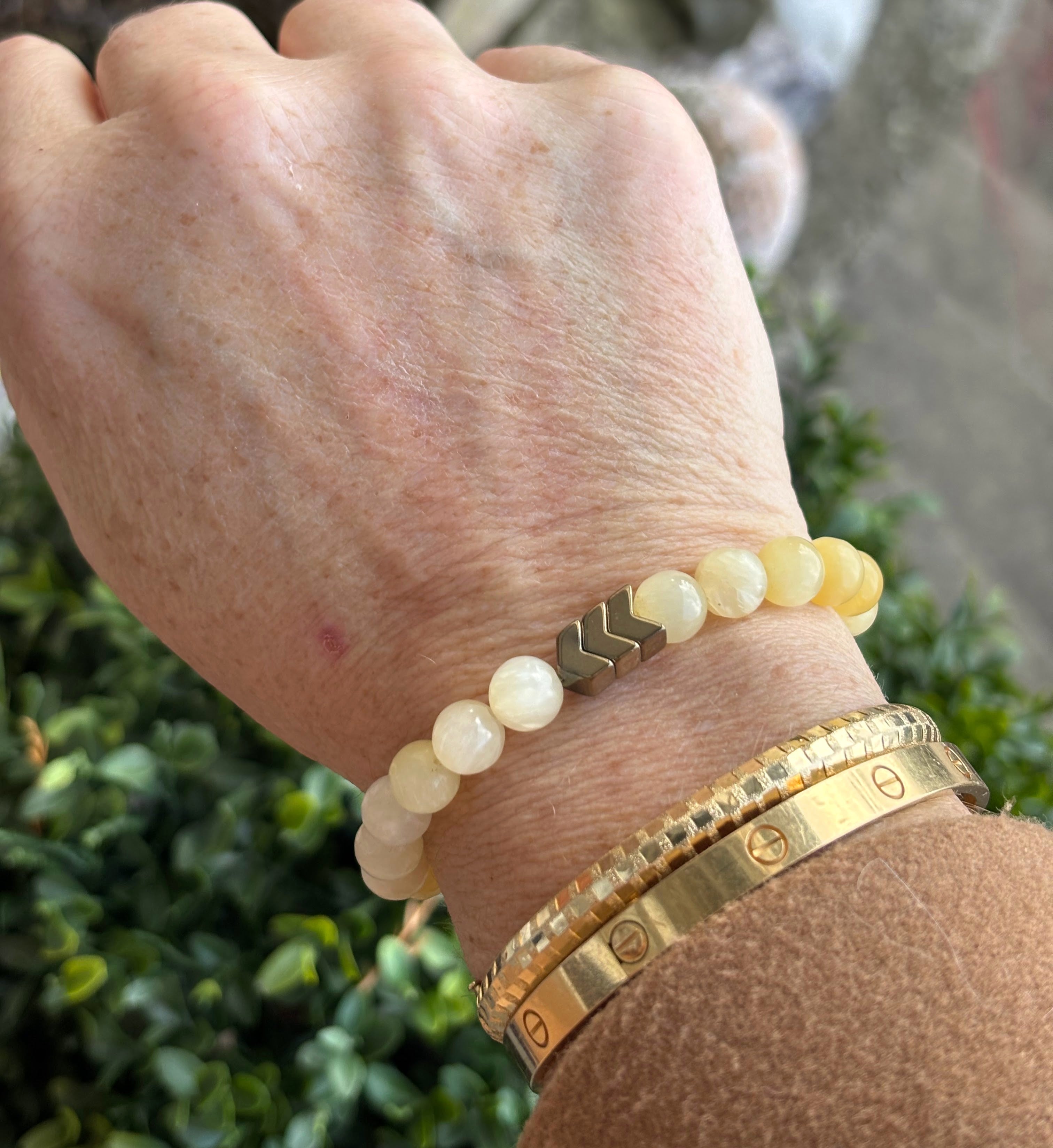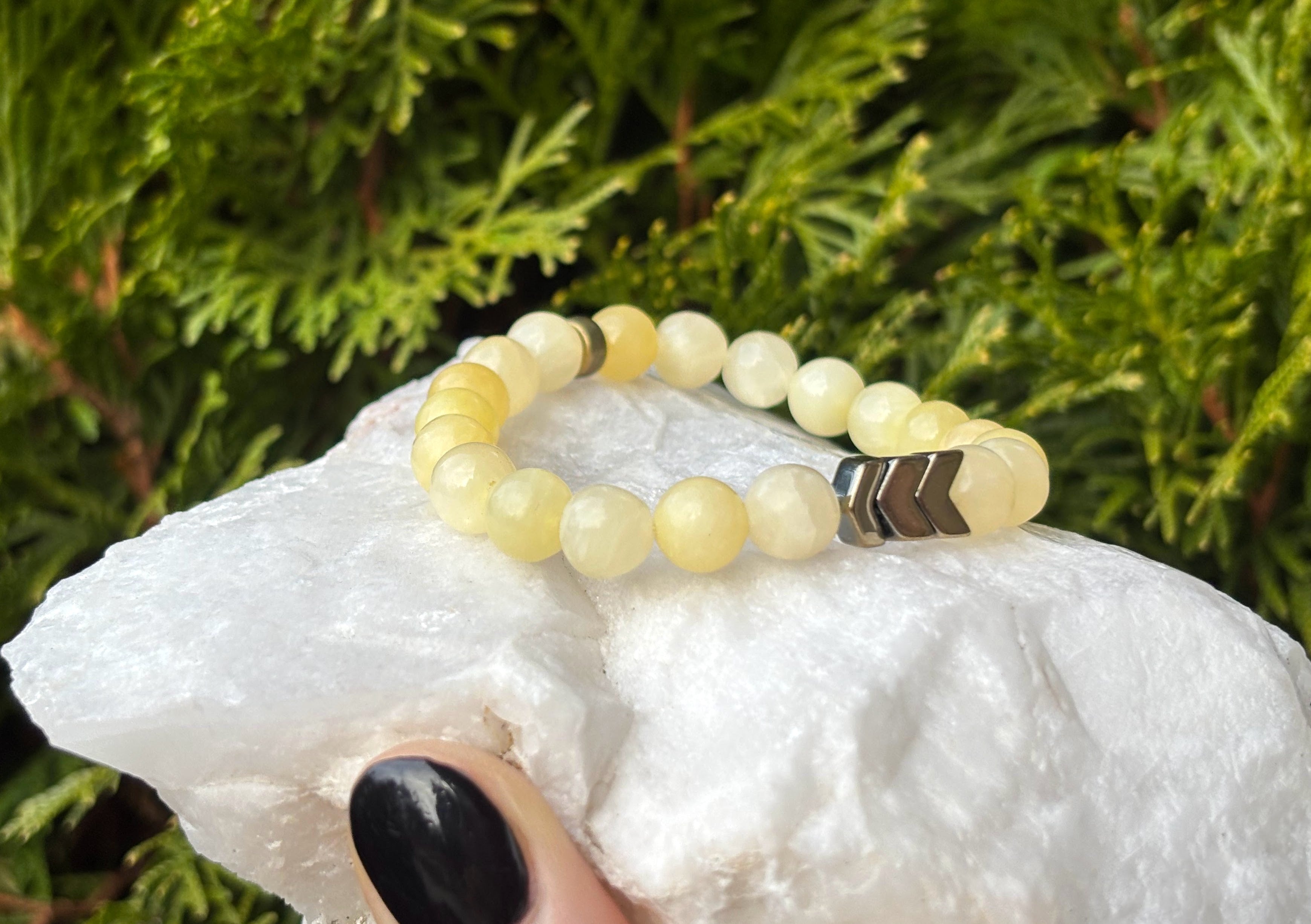 Light yellow Jade and electroplated Hematite. 8mm beads.