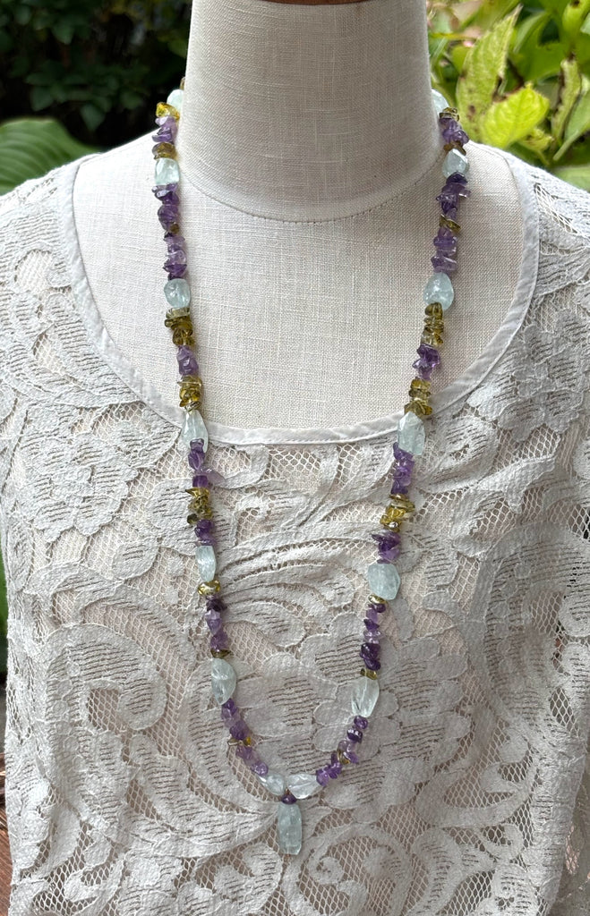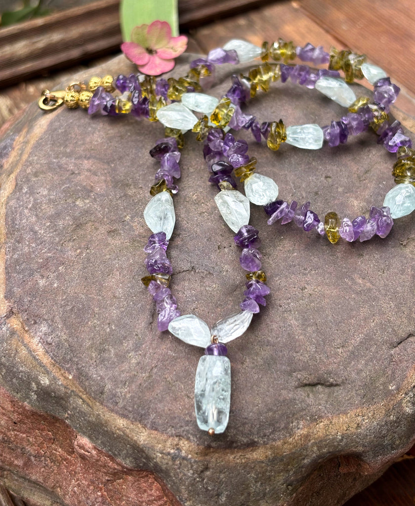 A mixture of Peridot and Amethyst chips are mixed with Aquamarine faceted stones. An organic ovalish faceted Aquamarine pendant.