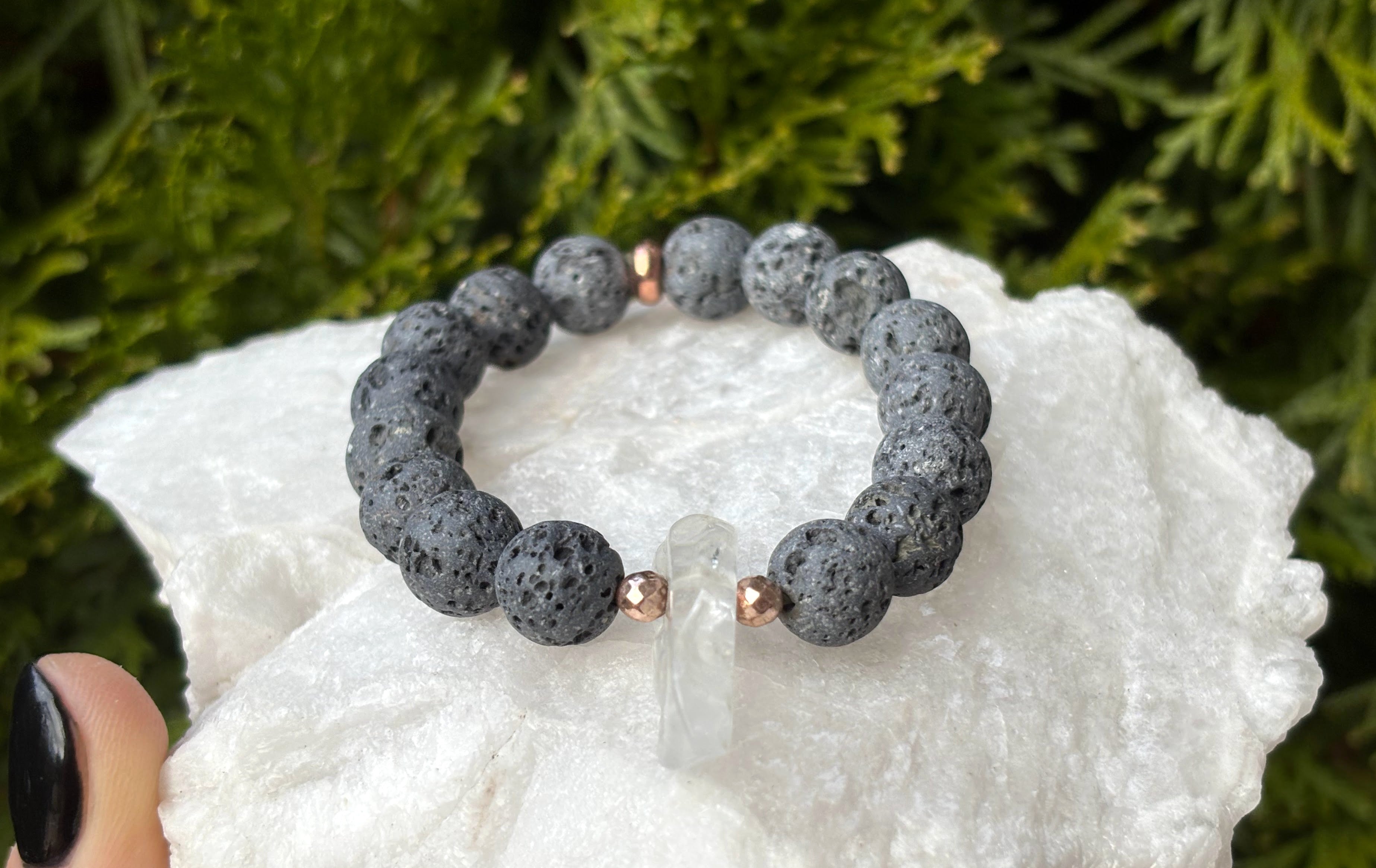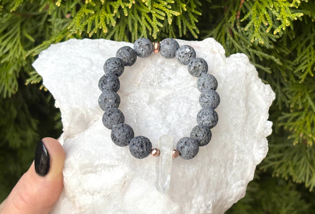 Magnifiques cristaux de quartz bleu arc-en-ciel électrolytiques entourés de pierres de lave grises naturelles de 10 mm et rehaussés d'accents en acier inoxydable .