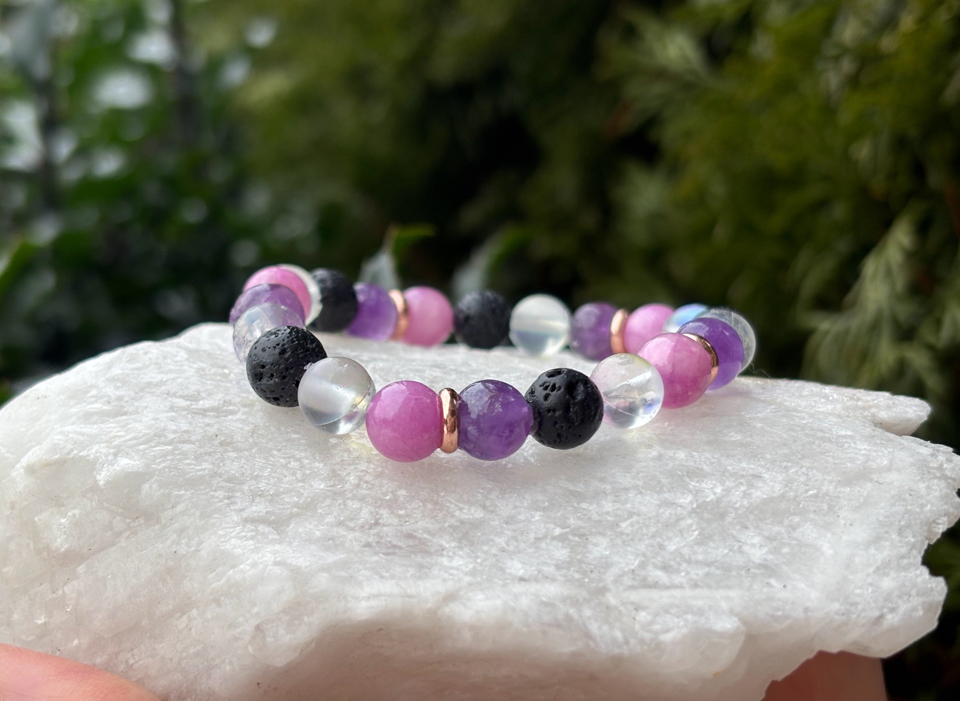 Ce bracelet extensible en perles est créé avec de l'améthyste semi-précieuse, de la pierre de lune artificielle, du jade coloré et de la lave. Perles de 8 mm.